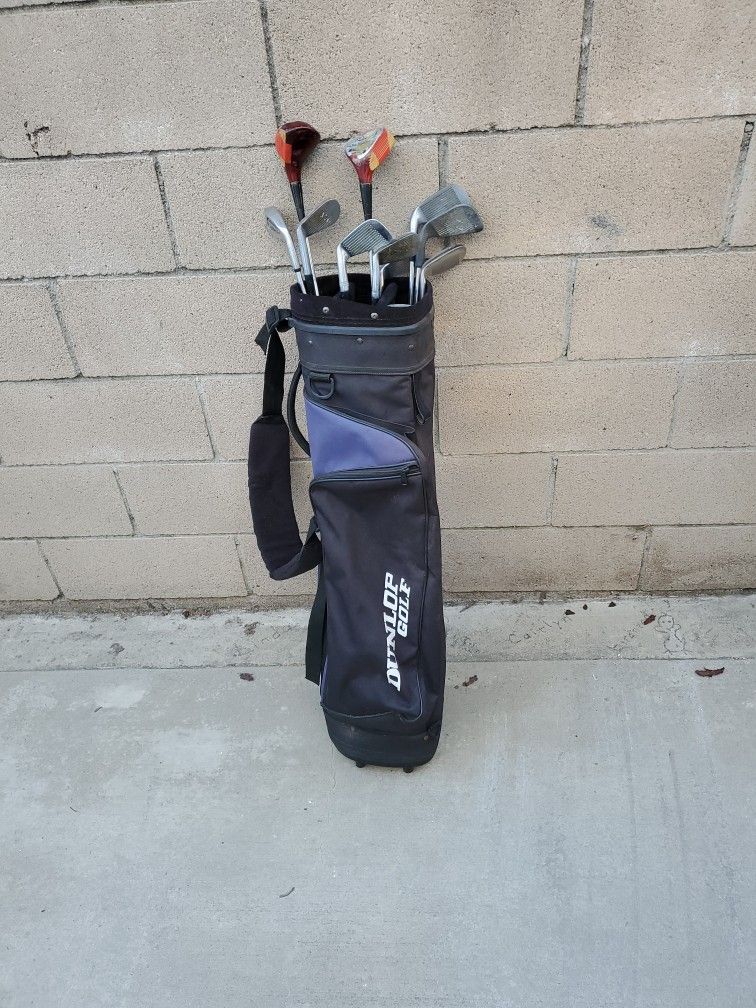Dunlop golf caddy with 11 clubs (Maruman, First Flight, Wilson, Cougar, Future Force). A little dusty, has been in storage.