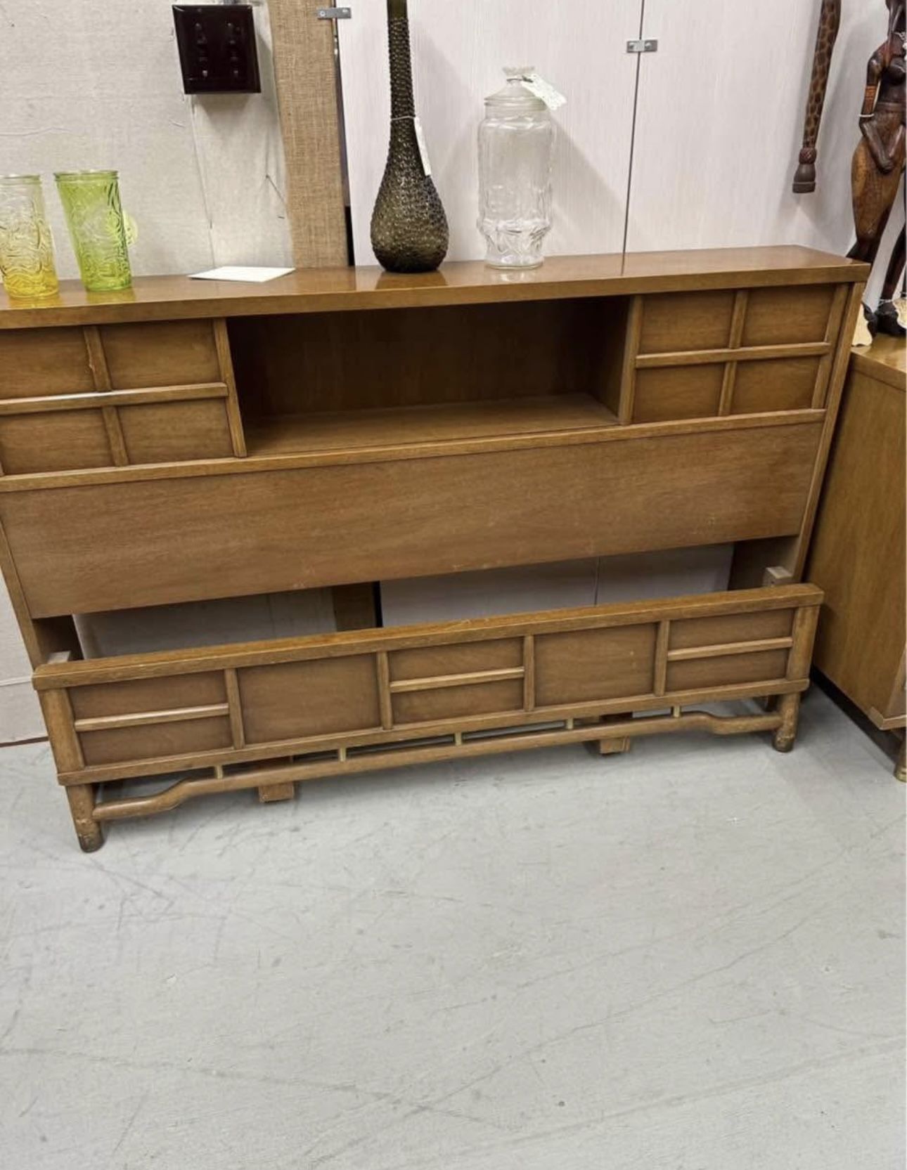 Vintage Mid Century Chinoiserie Asian Scandinavian Style Head board with sliding Doors & Foot board. Fits a Full Bed. Comes with metal bed rails too. The headboard and footboard is - 57” Wide x 9” Deep x 37” Tall It is located in - Main Street Antiques 208 E. Main Street Turlock, Ca. 95380 in booth #18. Ask for booth, there are two locations of #18