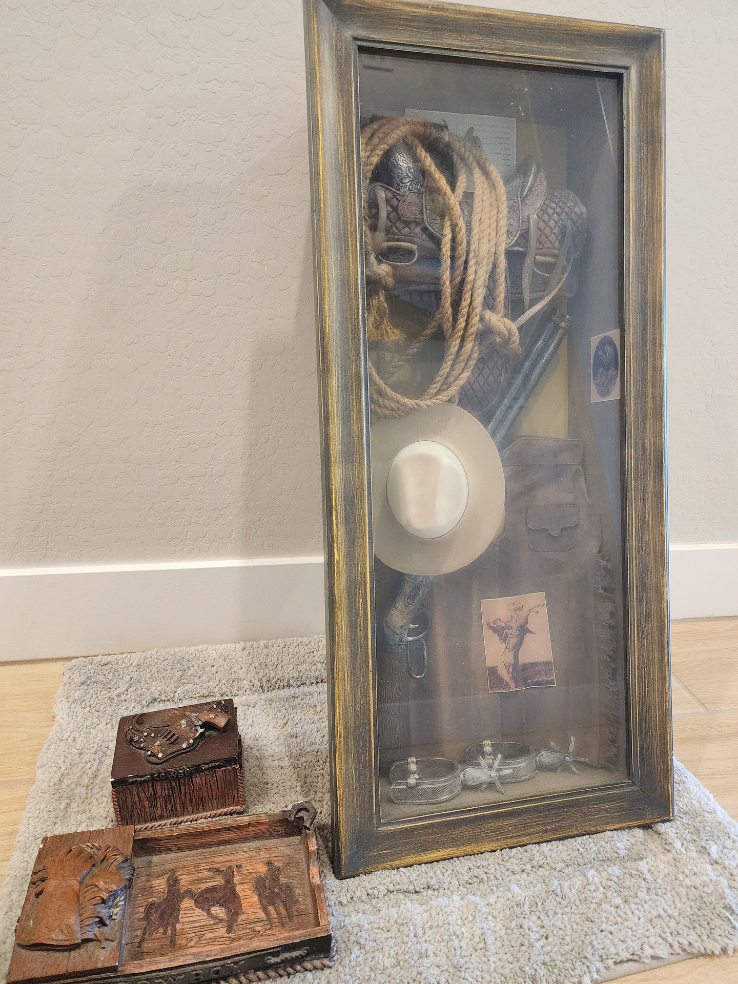 This is The Window Pane Curio Collection Western Shadow Box. Certificate of Authenticity. Beautiful piece. Included Western Keychain Box and Jewelry Box.