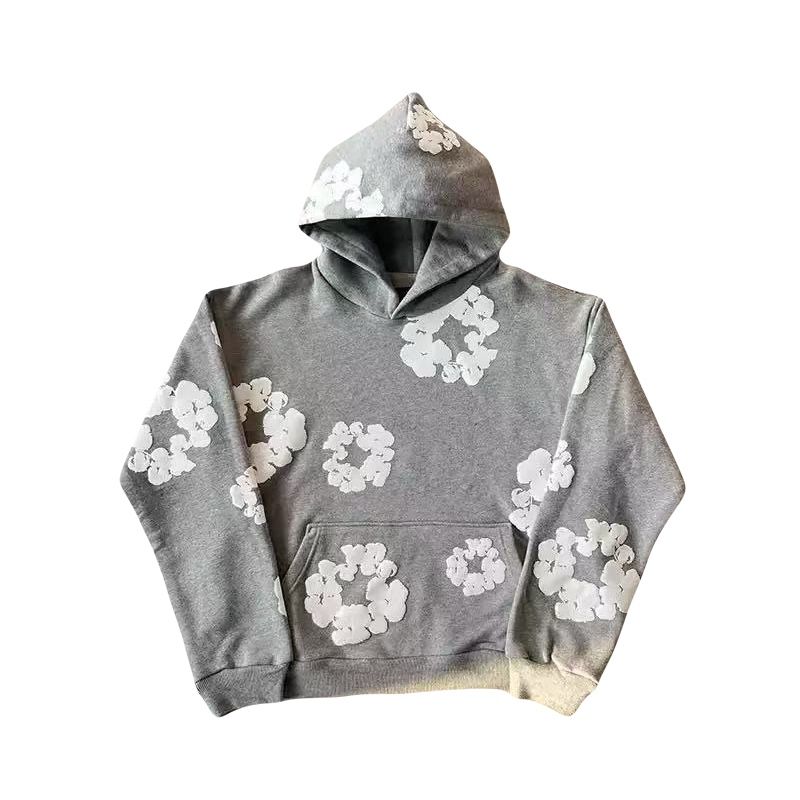 This popular style from the brand's capsule collection features a distinctive graphic print and premium construction. The hoodie is a heather grey color with a contrasting white abstract "Cotton Wreath" graphic pattern printed throughout the garment. It is made from heavyweight, premium 100% cotton fabric. The hoodie offers a regular or relaxed fit with drop shoulders and long sleeves. It includes a classic hood, a front pouch (kangaroo) pocket, and ribbed cuffs and hem. The garment is manufactured in Portugal.