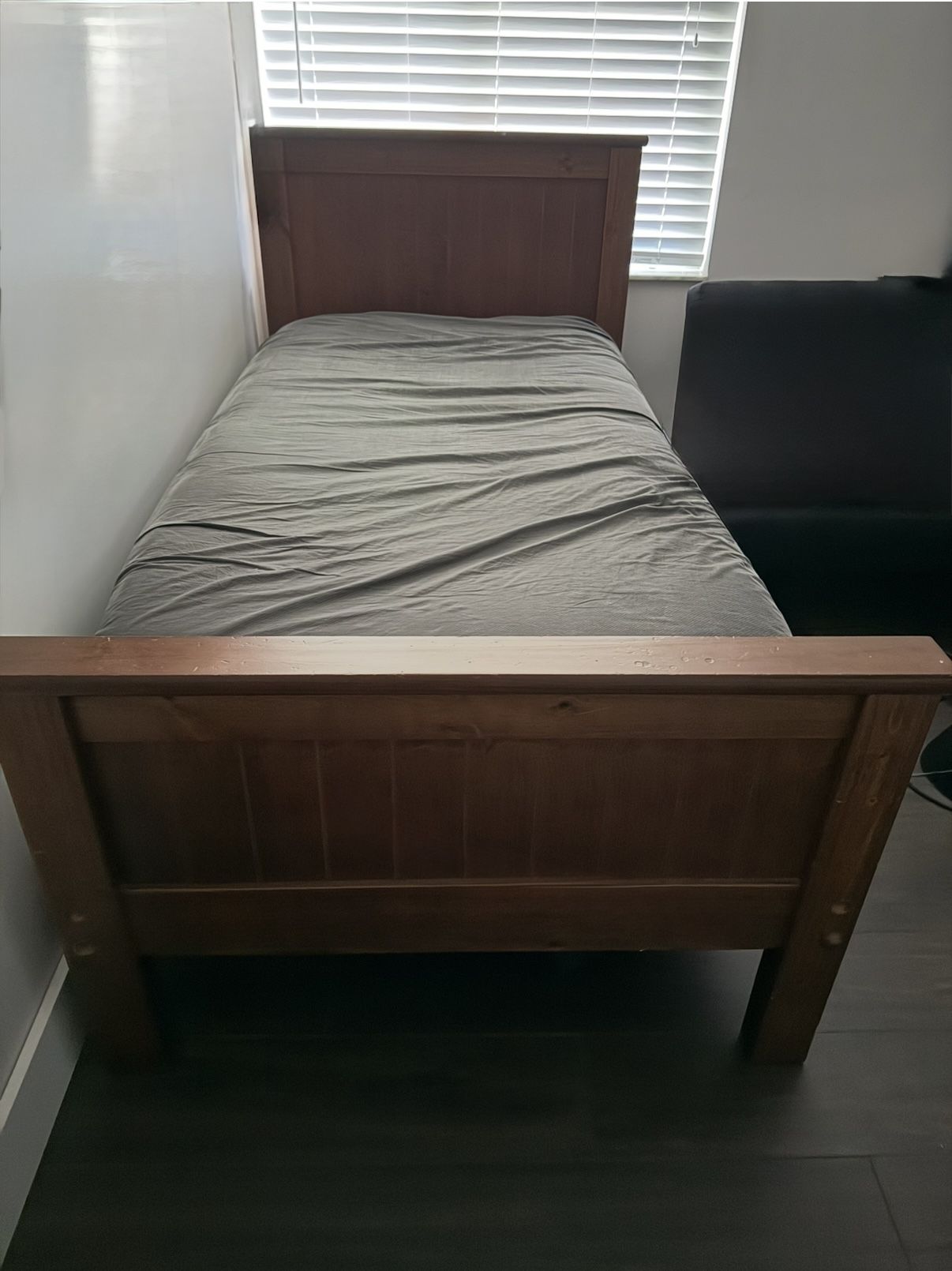 Solid cherry wood twin bedroom set Twin bed Tall dresser 32” wide x 19.5” deep x 49” height 4 drawers 8” deep full length 2 drawers 6” deep 14” length Nightstand table 21” wide x 18.5” deep x 25” height 1 drawer Storage Chest 37” wide x 21.5” deep x 18” height Mattress, comforter and books shown are not included