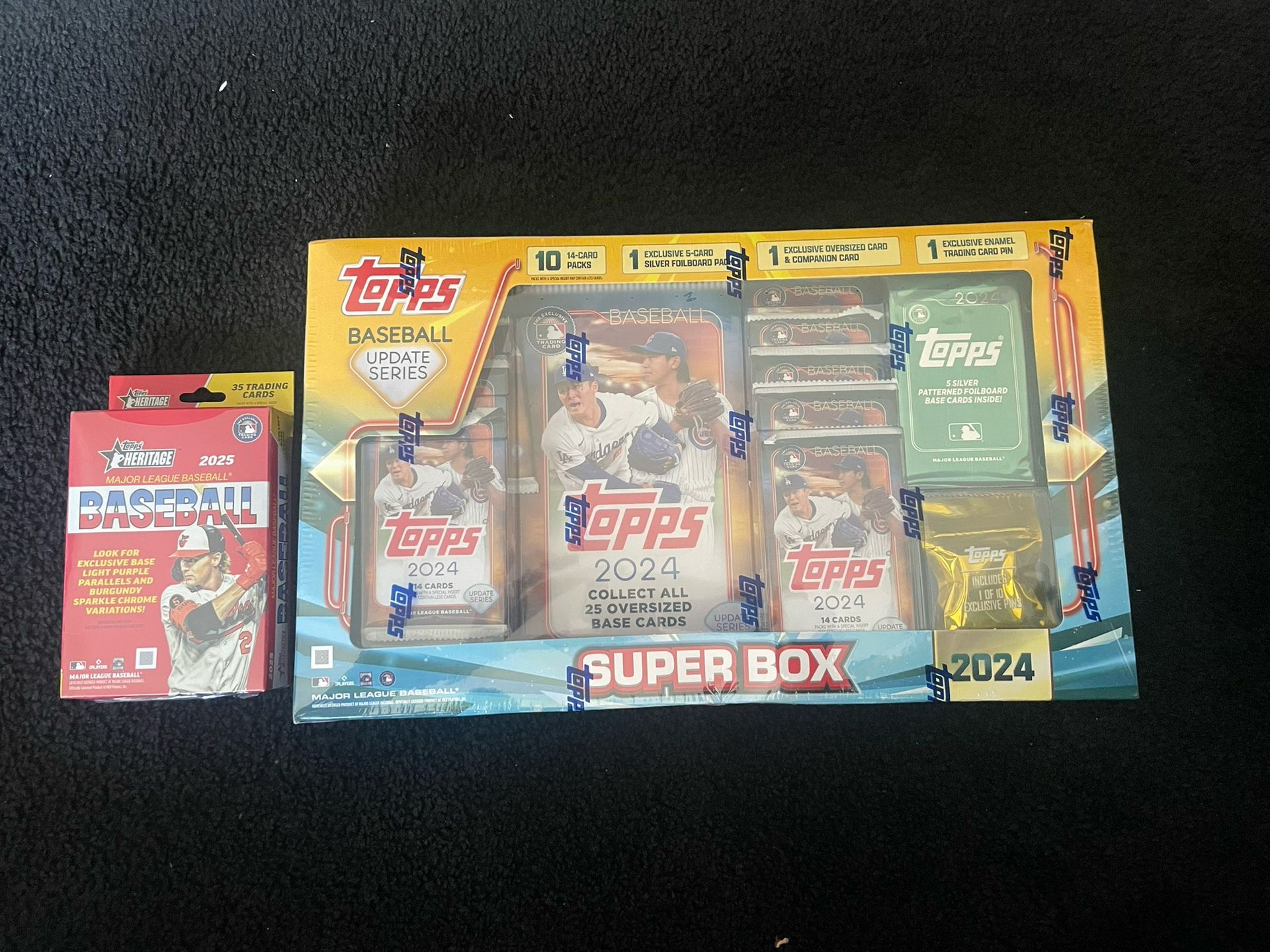 Factory sealed 2024 Topps Update Baseball Super Box- $60 2025 Topps MLB Heritage Baseball Trading Card Hanger Box- $10
