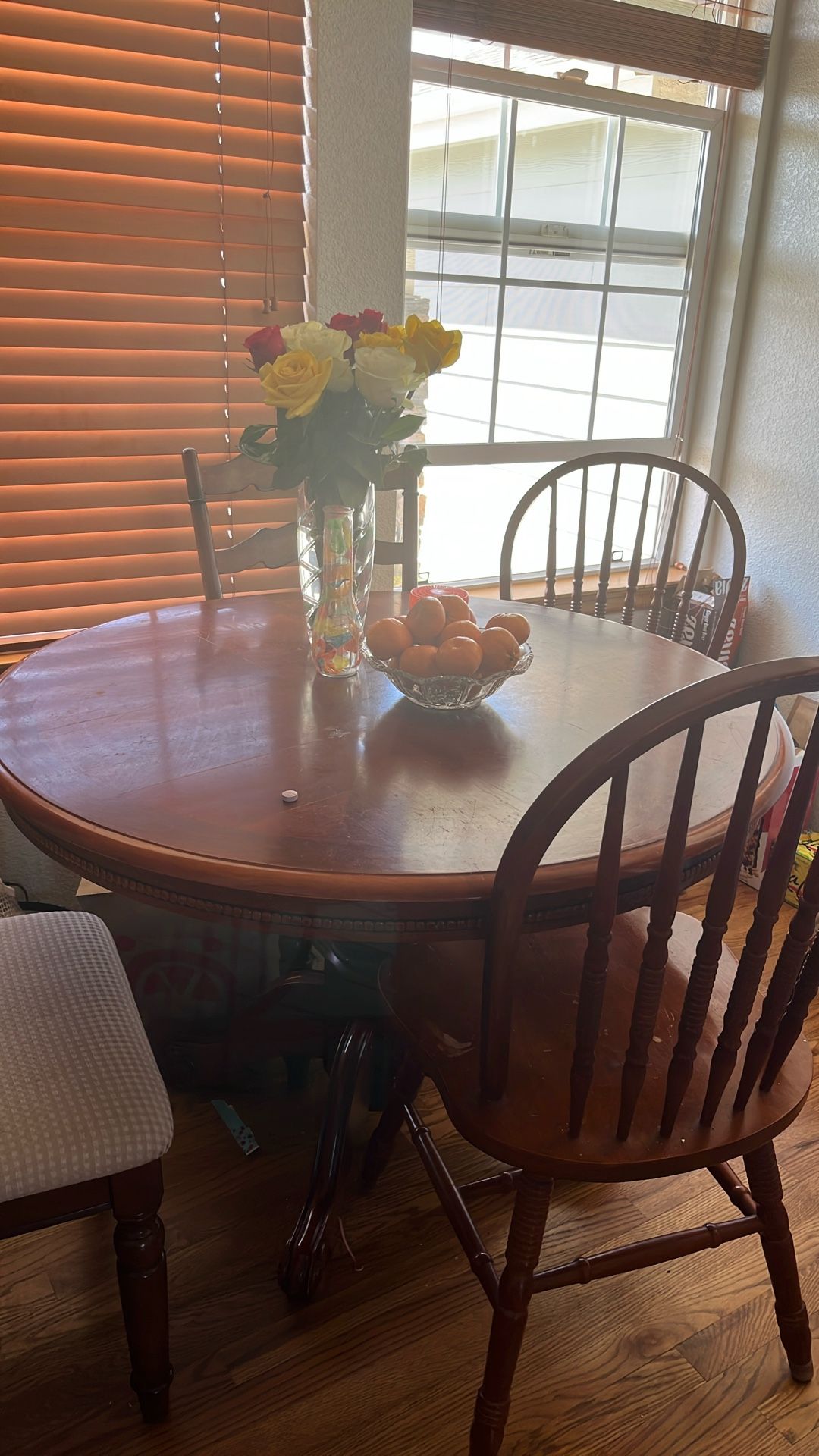 Beautiful chestnut table. Lovely base. 4 chairs. Some faded spots and scratches.