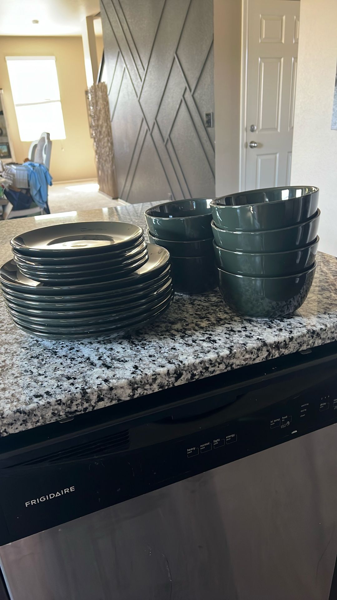 21 piece project 62 stoneware dish set. Dishwasher and microwave safe. 7 pieces of each plate, dinner plate and bowl.