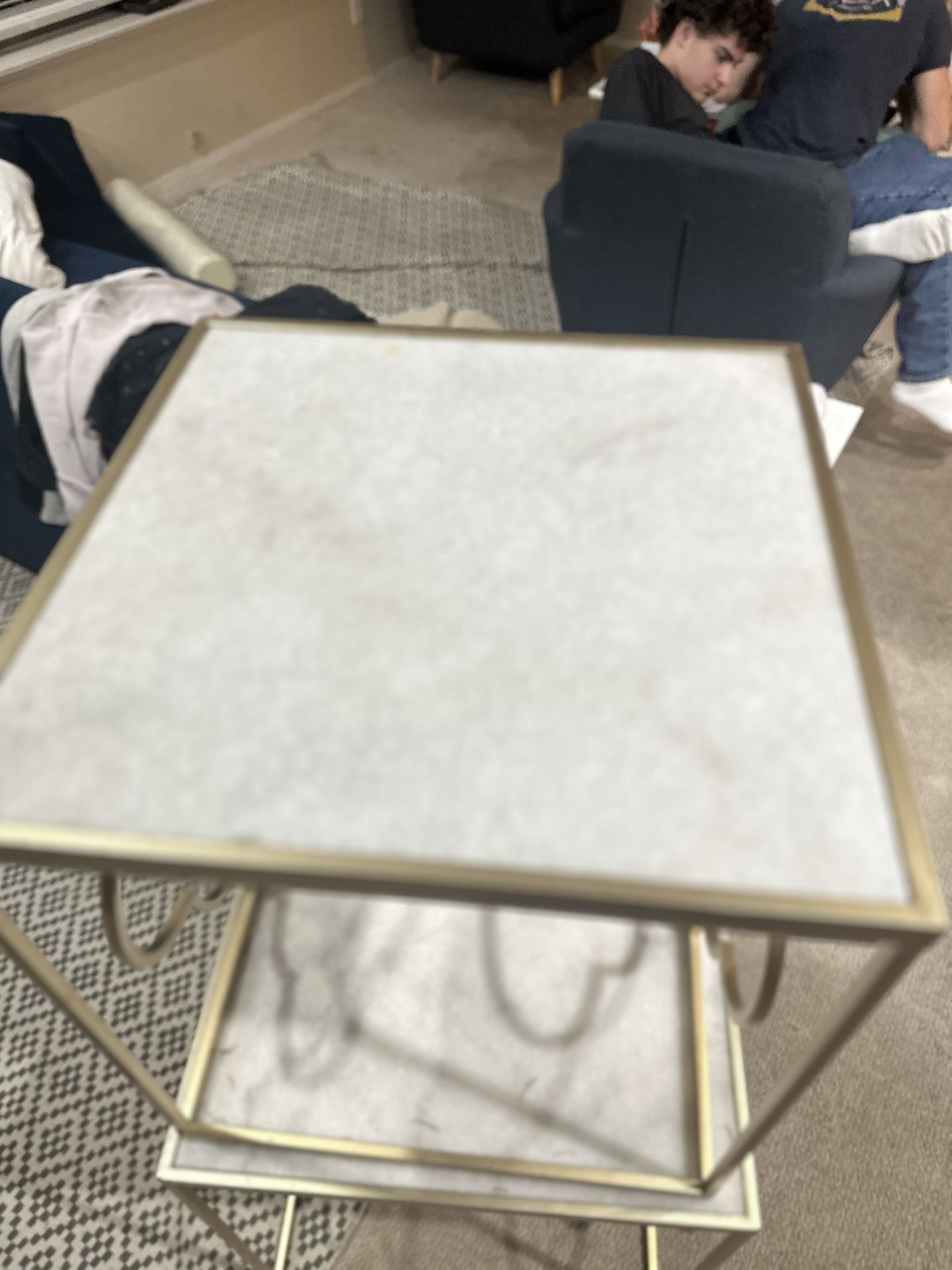 Two gold-frame and marble top side tables. Not neatly nesting, but can be used together. Will separate.