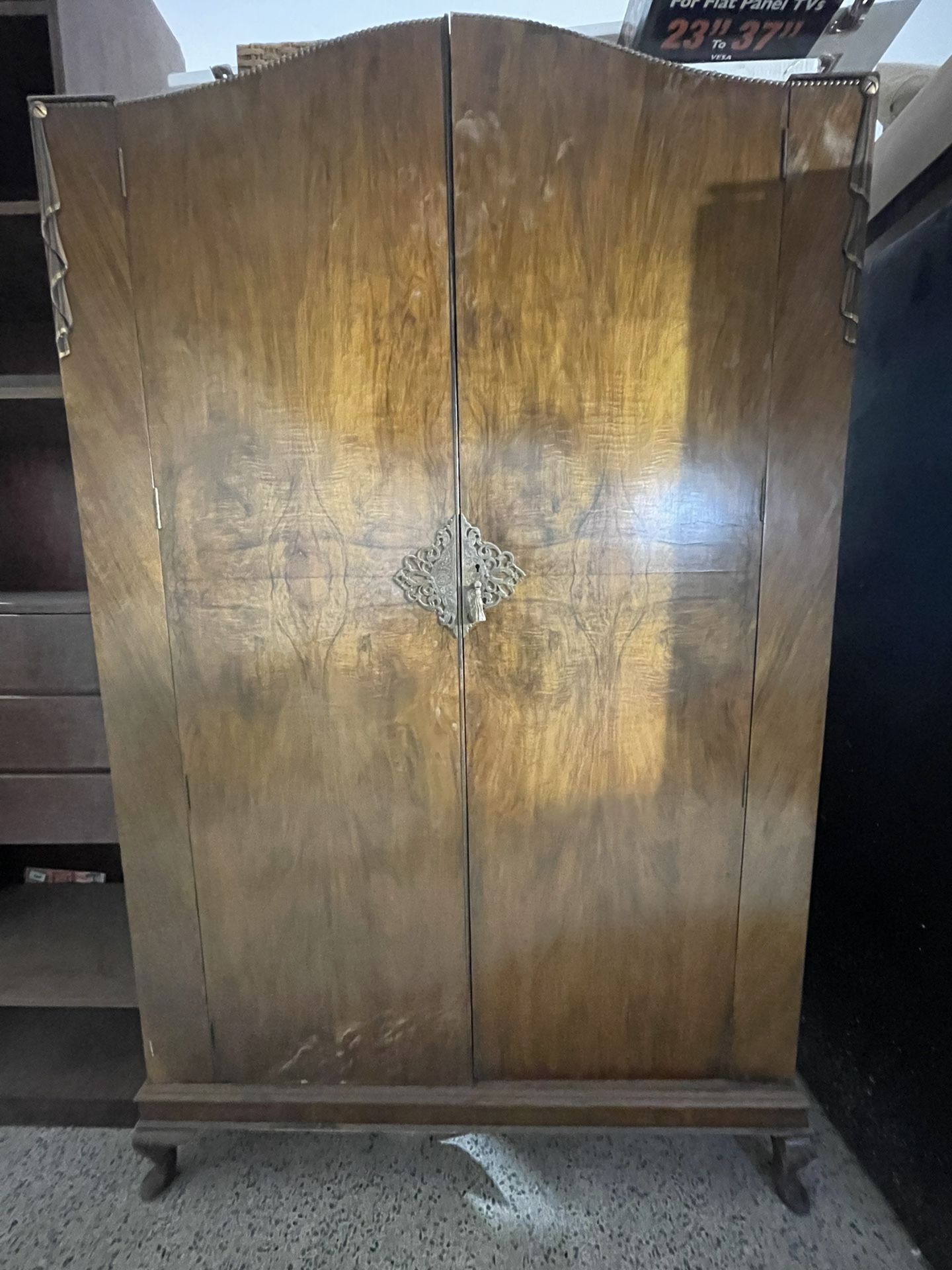 Beautiful antique wood armoire 8 shelves/square shelves Can use for TV (has holes for wire in back) Great for clothes or storage Dark brown wood Bottom/legs detach from top Measurements: Width: 48 inches Height: 77 inches Depth: 18.5 inches Excellent condition Cash only, pick up near Bird Road and 57 avenue, Miami