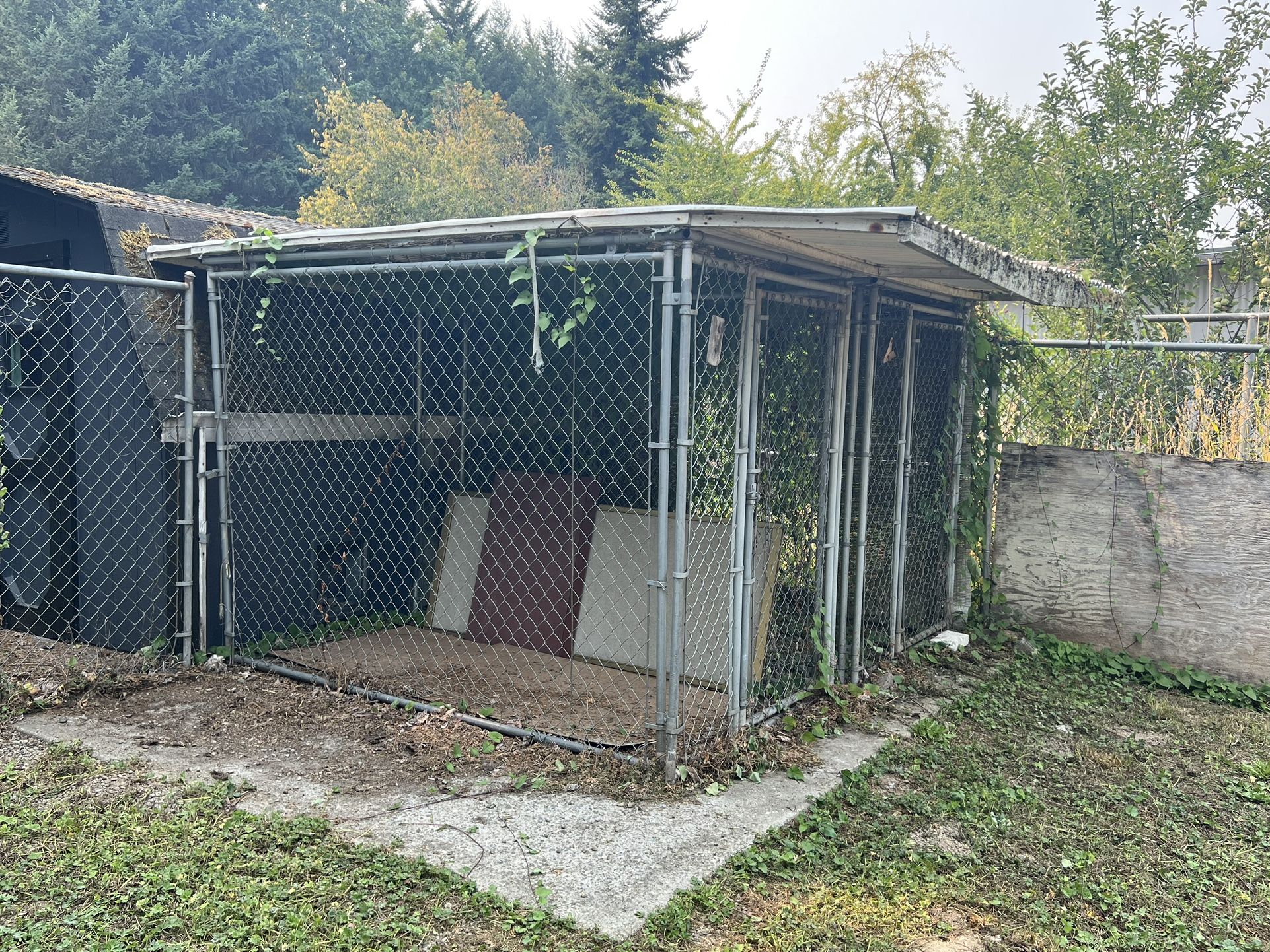 We have two dog kennels that are connected by one roof. Can be sold separately or together with the roof. Would be best if they are up against a wall as there is no back wall. Dimensions of each: 8’3” long 53” wide Door measures 32” $200 each Will throw in the roof free if you purchase both.