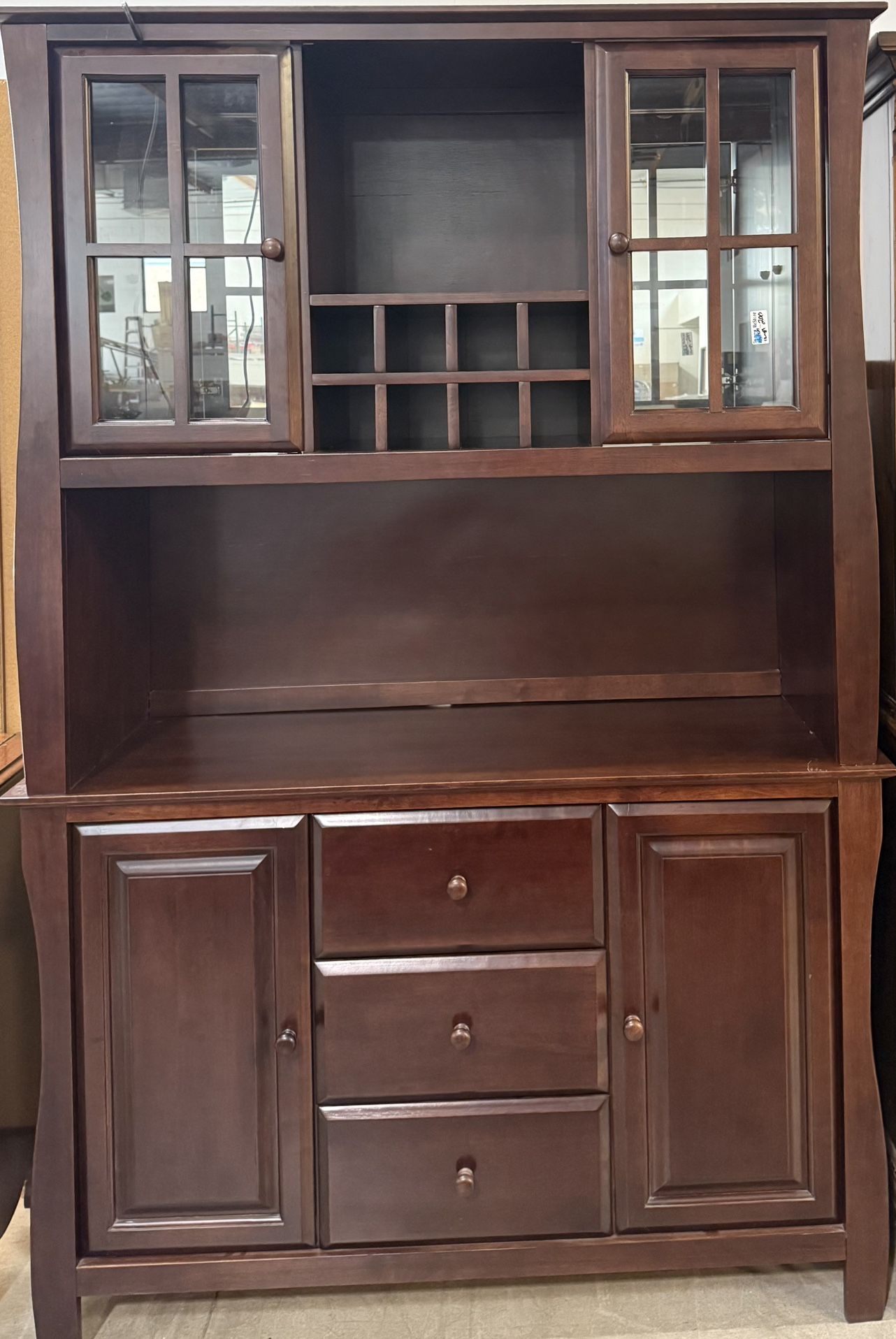 This piece is a wooden china cabinet hutch, which often features a rich mahogany or cherry finish and includes a wine rack. These functional pieces typically come in two parts, a buffet base and a hutch top, providing display space with glass doors and ample storage in cabinets and drawers. Material and Finish: Often made from a combination of solid wood and veneers, such as Asian hardwoods or mahogany, in a dark cherry or brown finish. Design: A traditional or contemporary design with cabinet doors, drawers, an open display area, and a built-in wine rack in the hutch section. Storage: Features multiple drawers (often three, as pictured) and cabinets for storing dining essentials, as well as the specialized rack for wine bottles.