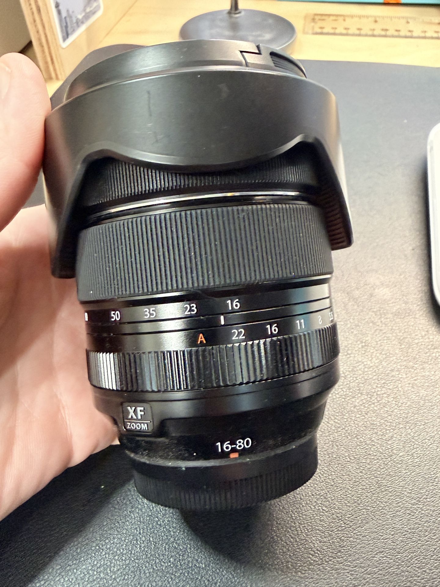 Gently used and in great condition. FUJINON XF16-80mmF4 R OIS WR has a maximum aperture value of F4 throughout the focal length of 16-80mm (equivalent to 24-122mm in the 35mm film format). This lens has a minimum shooting distance of 35 cm over the entire zoom range, which gives a maximum shooting magnification of 0.25x. The compact and lightweight lens weighs only 440g which is approximately 40% lighter than an equivalent lens for a 35mm format system. When attached to an X-T3 the kit weighs only 979g and 823g when combined with X-T30, making it the ultimate travel combination. This new standard zoom lens features 6.0-stop OIS, meaning you can comfortably shoot in a wide variety of situations from a night scene or indoors without worrying about camera shake.