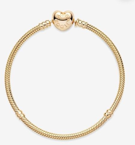 Take pride in your style with the Pandora Moments Heart Clasp Snake Chain Bracelet. S925 14k gold plated, this design includes a heart-shaped clasp. Featuring our iconic snake chain, the bracelet has threaders and stoppers to keep your favorite charms in place. Wear this style on its own as a statement piece or team with contrasting chain link bracelets for a multilayered look with added texture. Size 6.9 inches 17cm