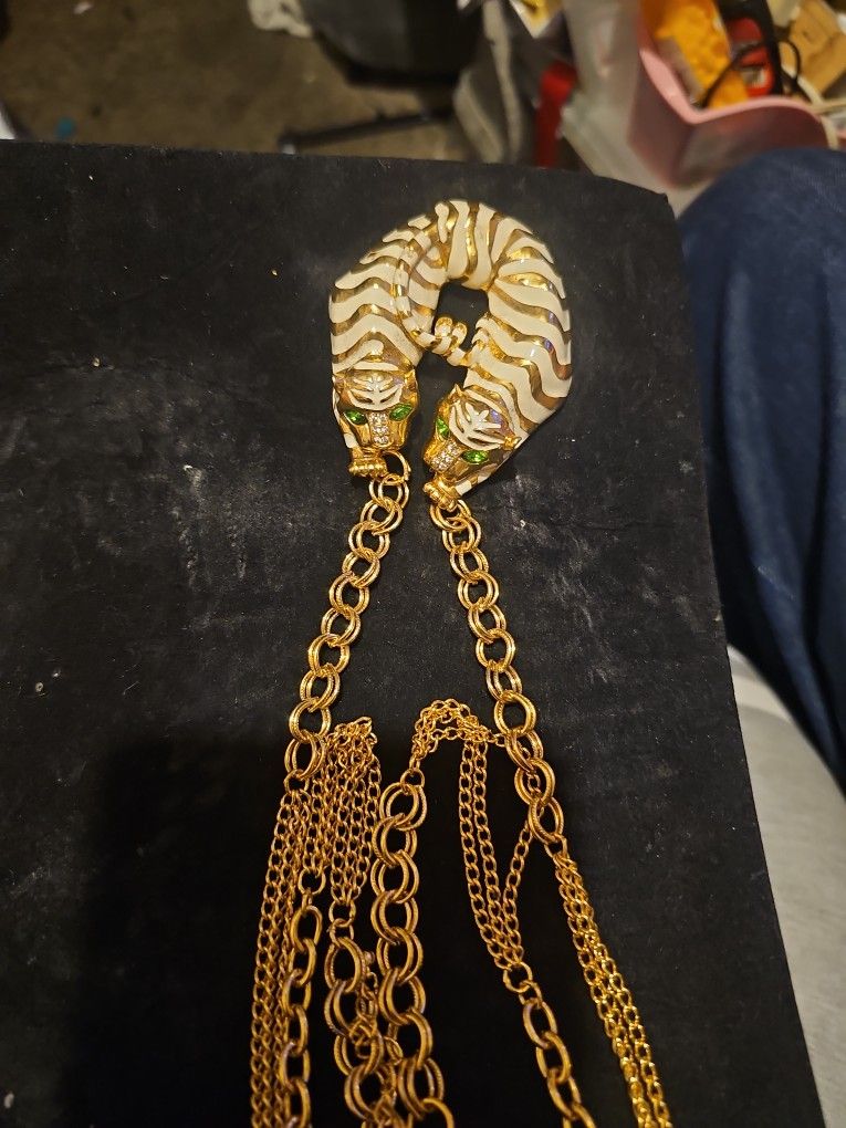 Long Double Tiger Pendant Emerald Eyes And Rhinestone Nose