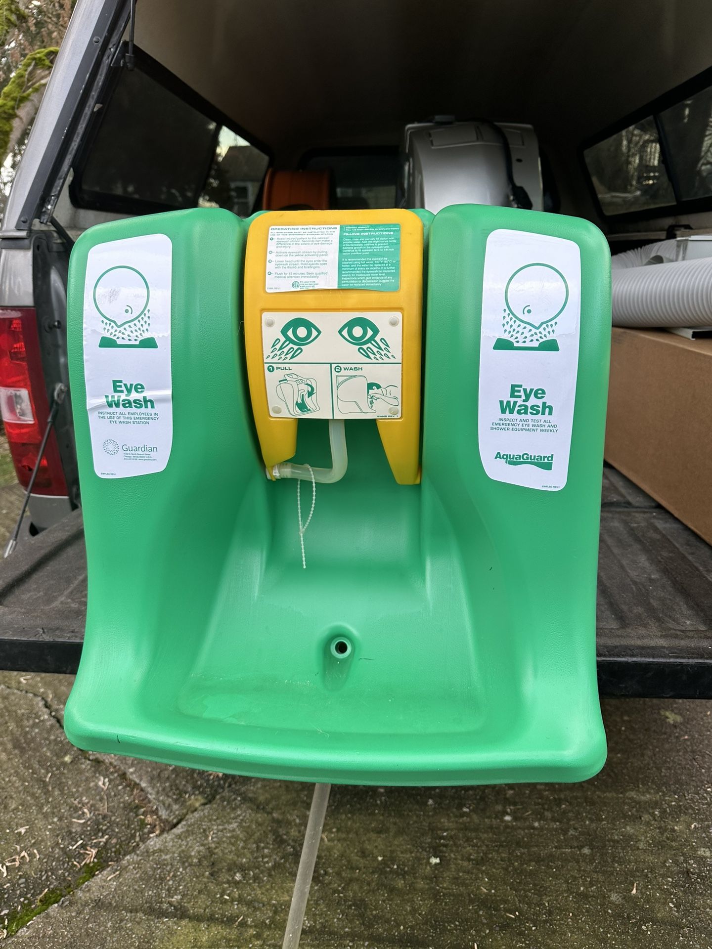 Price new - $280-330 plus shipping. Portable, gravity-operated eyewash station Holds 16 gallons of water for ANSI-compliant 15-minute flush Easy activation for immediate use in emergencies Wall-mounted or placed on a flat surface for accessibility Indoors or outdoor use without direct water supply Portable, self-contained eye wash is ideal for remote locations that do not have a water source. Eye wash flow is gravity activated. 16 gallon high density green polyethylene tank. Tank has heavy wall construction and reinforced ribs to support weight of unit. Unit can be counter or wall mounted with no additional plumbing required. Unit ships with 8 oz bottle of bacteriostatic additive. Unit meets ANSI Z358.1 standard as primary eye wash. APPLICATION: Self-contained 16 gallon gravity flow eye wash unit uses gravity to deliver water through dual spray heads. Unit delivers over fourteen gallons (53 liters) of water for fifteen minutes, thus complying with the provisions of ANSI Z358.1-2004 for eye washes. Unit has a rugged plastic tank that can be installed in a wide variety of locations. Unit is ideal for use where a continuous supply of potable water is not available, especially in remote plant areas, low traffic and/or low hazard areas. TANK: 16 gallon capacity safety green polyethylene tank. Tank has built-in carrying handle, heavy wall construction and reinforced ribs to support weight of unit. SPRAY HEAD ASSEMBLY: Water flow is activated by pulling down on bright yellow eye wash tray. Integral full flow nozzles deliver soft spray of water. Swing tray up to storage position to stop flow. DRAIN: Waste water is directed into drain opening in tank basin. 3 ft. long drain hose in basin directs discharge into floor drain, storage tank or other receptor. MOUNTING: Furnished with epoxy coated steel bracket for mounting unit on wall. Unit can also be placed on countertop or other flat surface. PREPARATION: Top operate unit, fill unit with clean potable water and add bacteriostatic additive. Additive protects against growth of bacteria, fungus, algae and acanthamoeba. Unit should be inspected regularly and water in unit should be changed at least once every six months. DISCHARGE TIME: Eye wash delivers .7 gallons per minute for 15 minutes. weight: 13 lbs. (5.9 kg.) empty, 146 lbs. (66 kg.) full.