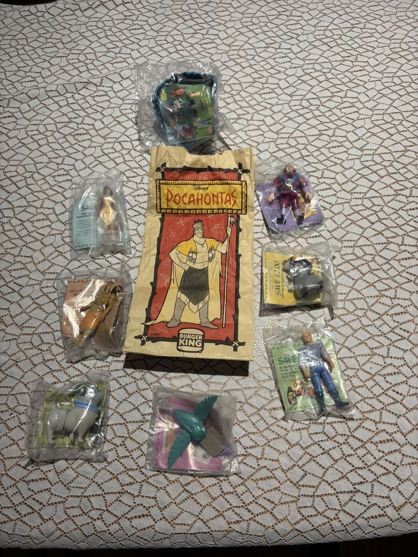 Disney Pocahontas Burger King 1995 Kids Meal Toy Set 8 Toys w/ Packaging with original bag from promotional time and I’m asking $50 obo