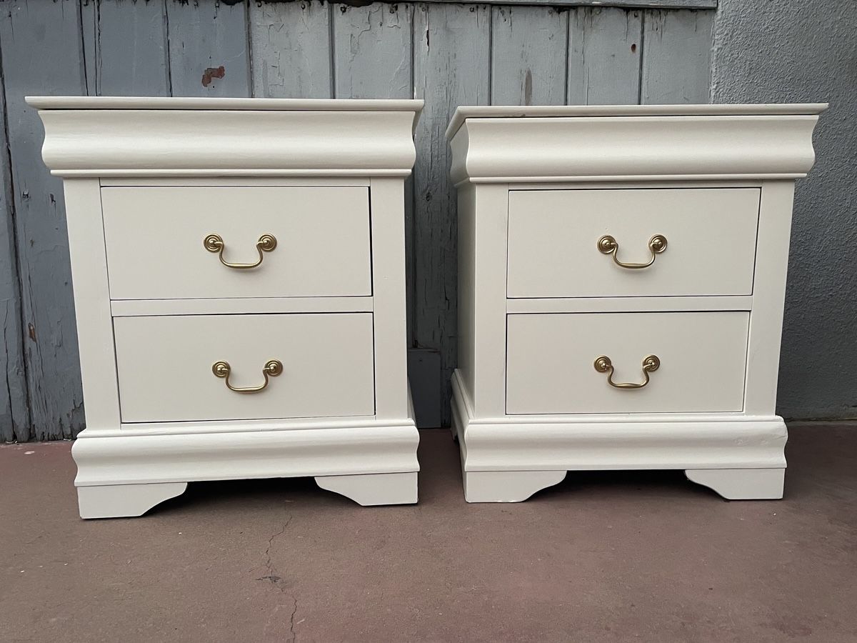 Two White Nightstand With Three Drawers InVery Good Condition All Drawers Open Just Fine Dimensions high 27 inches wide 24 inches deep 16 inches