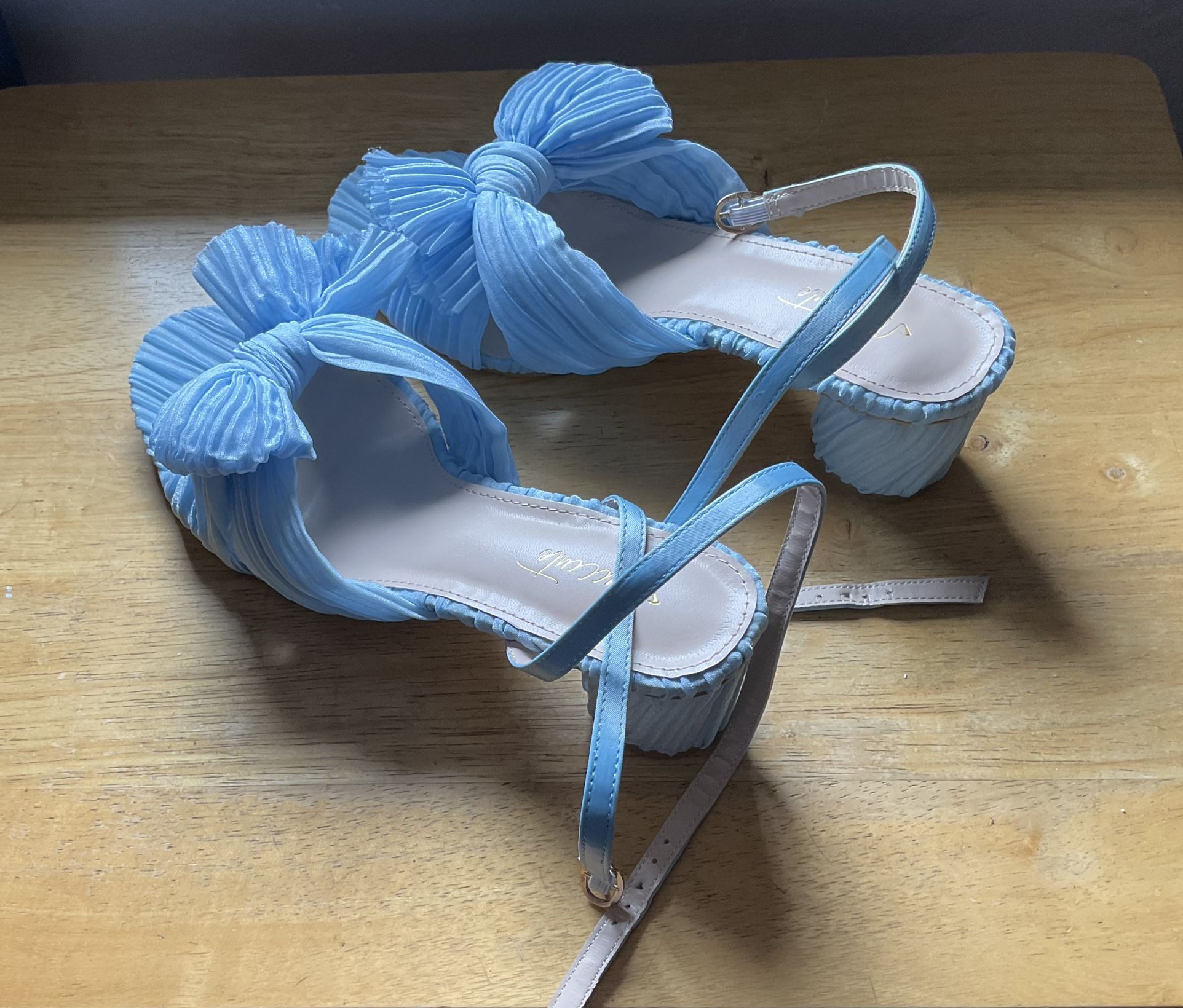 Pale blue open toe, chunky cylindrical 2-1/4” heel with adjustable ankle buckle strap. Size 8. Shoe width 3-1/2”, length 9-1/2”.