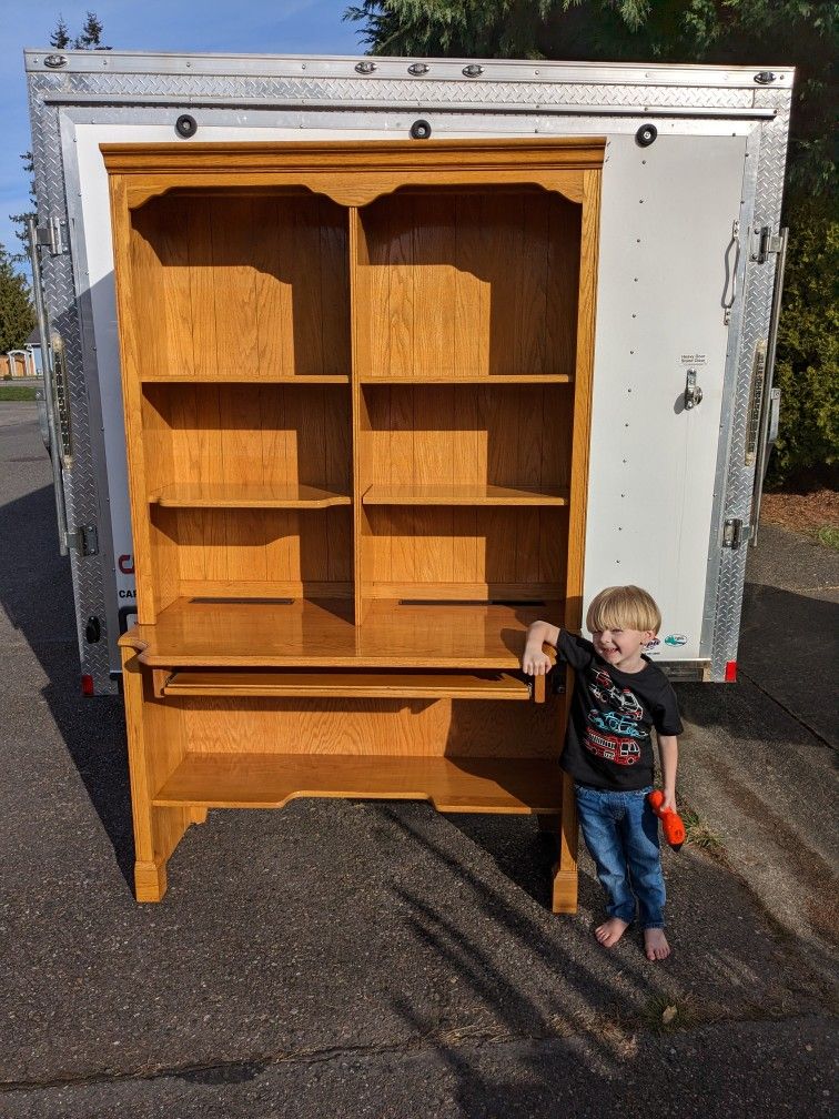 NEW REDUCED PRICE! My partner and I just finished cleaning up and assembling this beautiful solid oak 2 piece computer desk from "Ethan Allen". I believe it's dated 1993, but this cannot be compared to newer cheap furniture. It is of the highest quality, and it shows. Came from a very clean non smoking home. Has a couple signs of wear, but overall, in great condition. The two upper shelves are permanently fixed in the hutch, but has three adjustable shelves (only two shown), one which is set up for a small printer or something electronic. Dimensions are as follows 48"W x 24.5"D x 78.5"T assembled. The top of the desk is 30.5"T. It has a built-in surge protected power block with heavy duty cord and plug. The only notable damage is a couple marks on the finish surface of one of the shelves, and then there is very small depression in the edge of the wood on the hutch from bumping something else in transport (both pictured). I offer free local delivery around the Marysville area for full price purchase. Outside local might be negotiable for reasonable fee. Was asking $280. Now $190