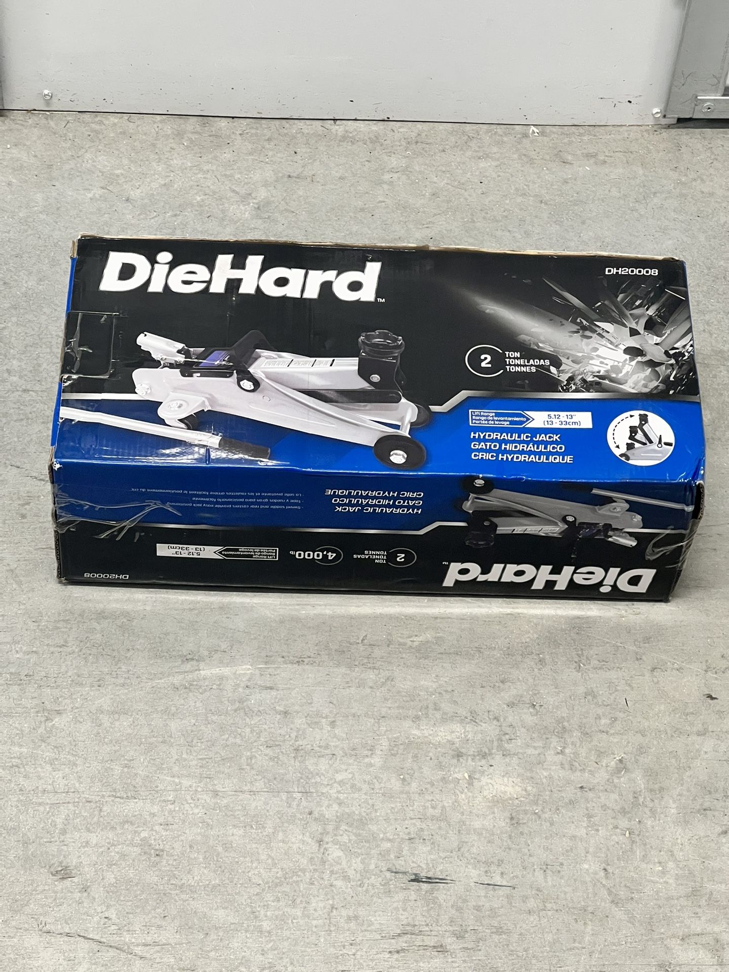 USED ONCE!!! DieHard DH20008 trolley jack has a 2 tons (4,000lbs) capacity with lifting range from 5.31 in to 13.39 in. This jack is constructed with durable steel chassis design and built in with safety over load system prevents use beyond rated capacity and hydraulic oil by-pass system protects ram from being over-extended. Comes with swivel saddle & rear casters for easy jack positioning.