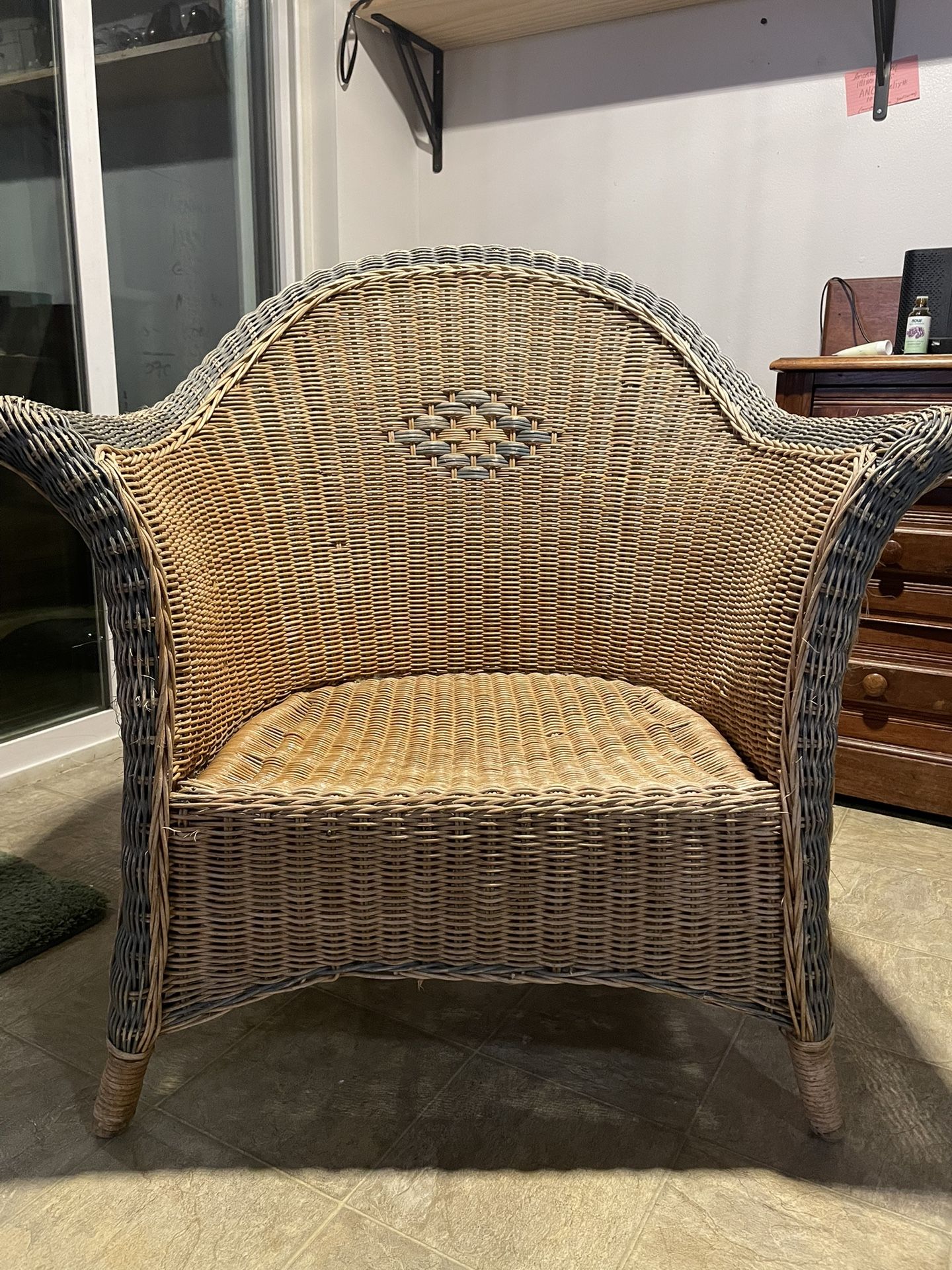 Nice wicker chair with pale blue trim. I used it in my living room with pillows, which I will throw in if you want them . Chair would also be great on a porch or in a bedroom.