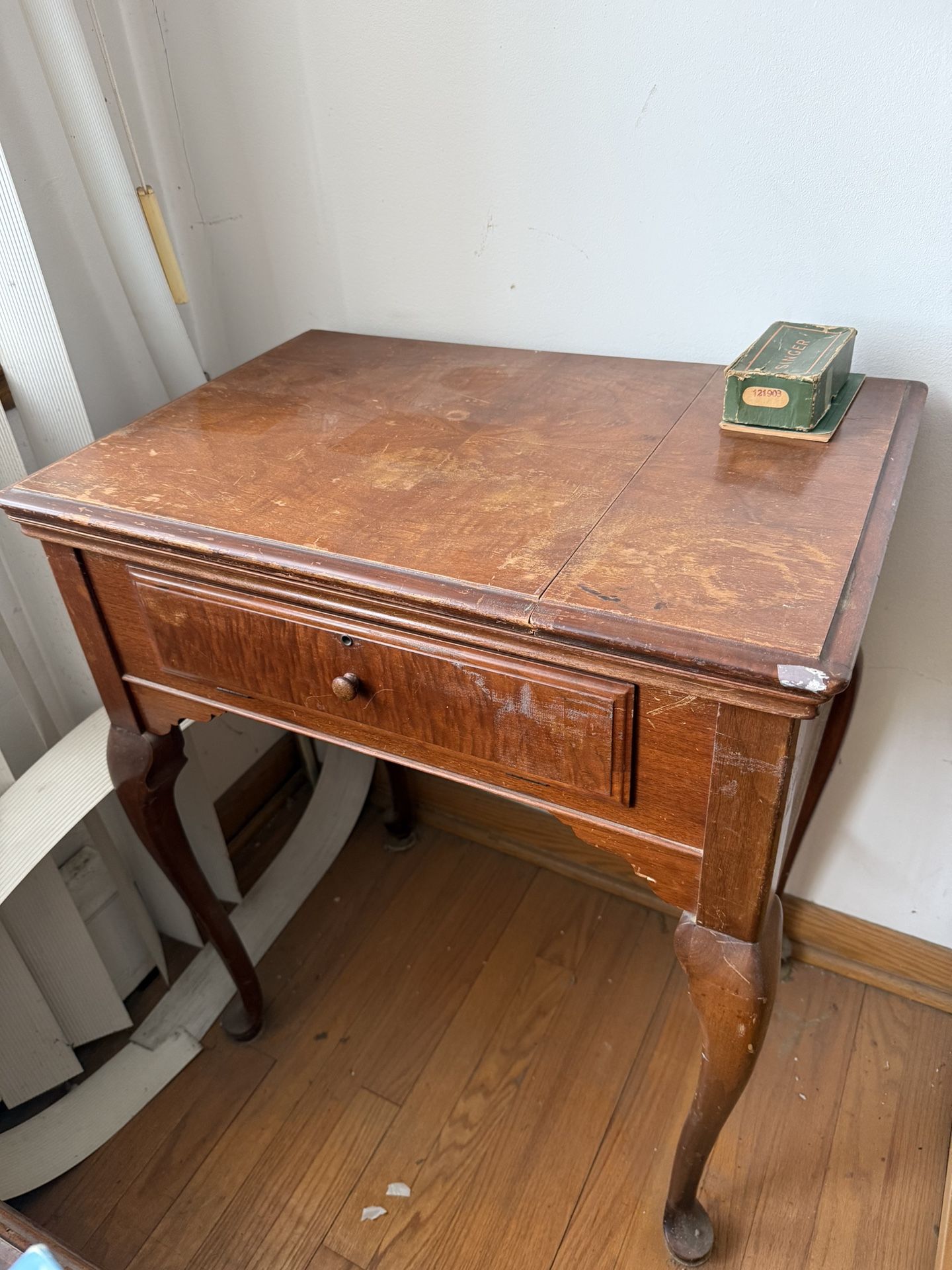 Singer 201-2 sewing machine enclosed in wooden housing. Believed to be from 1951. Comes with original instruction manual.