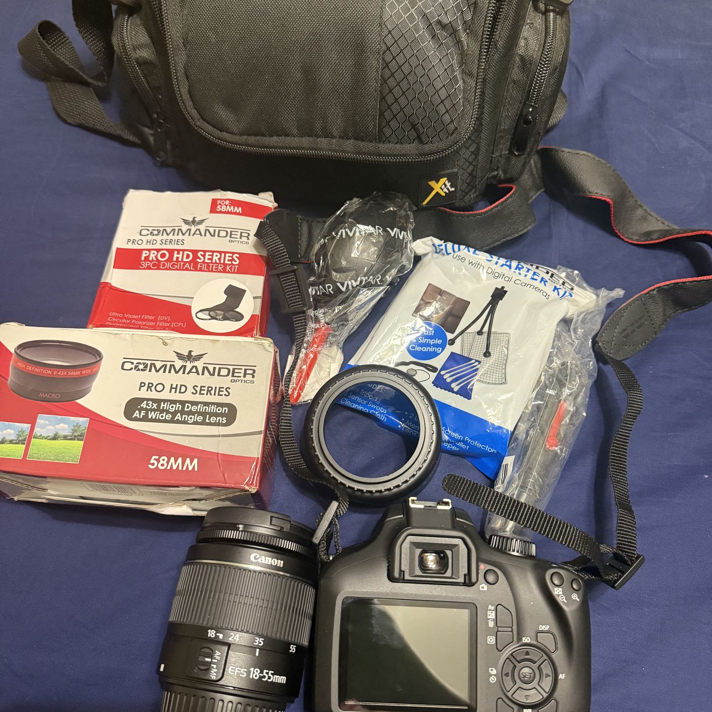 It comes with : -Canon Camera -Canon 18- 55mm lens -Camera Bag Extra accessories: -Filters ( UV/filter kit ) -Cleaning kit -strap + extras + camera stand