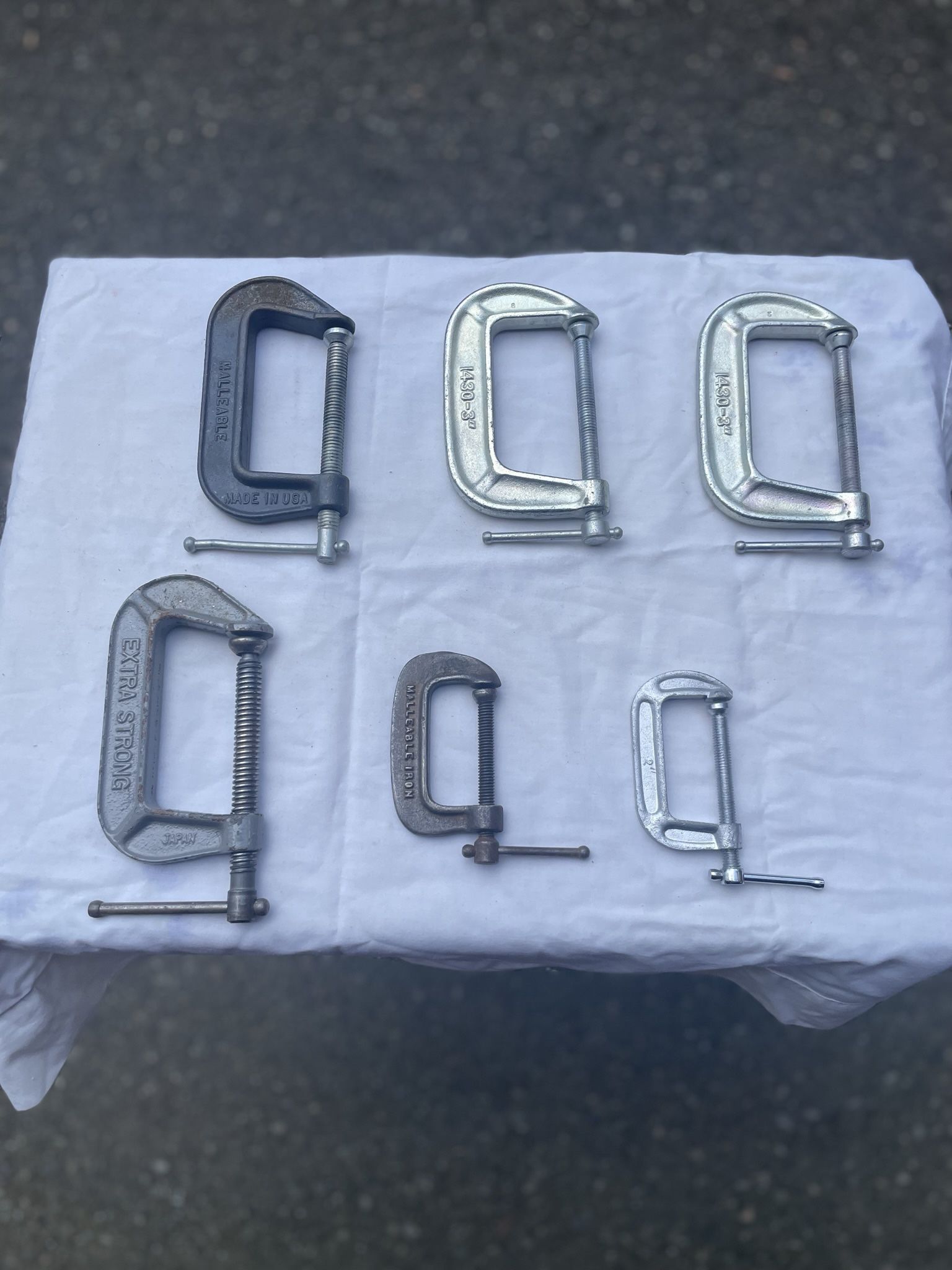 Selling a total of 8 C clamps listed BELOW: 1. Unbranded 1430-3” 2. Unbranded 1430-3” 3. Unbranded 2” 4. Fuller 3 in. (No 763) - Japan 5. B & C 3in. - malleable iron 6. Craftsman 3in - malleable - (66673) - made in USA 7. Craftsman 3in - malleable - USA 8. Craftsman (tiny - can’t read size) - malleable - usa