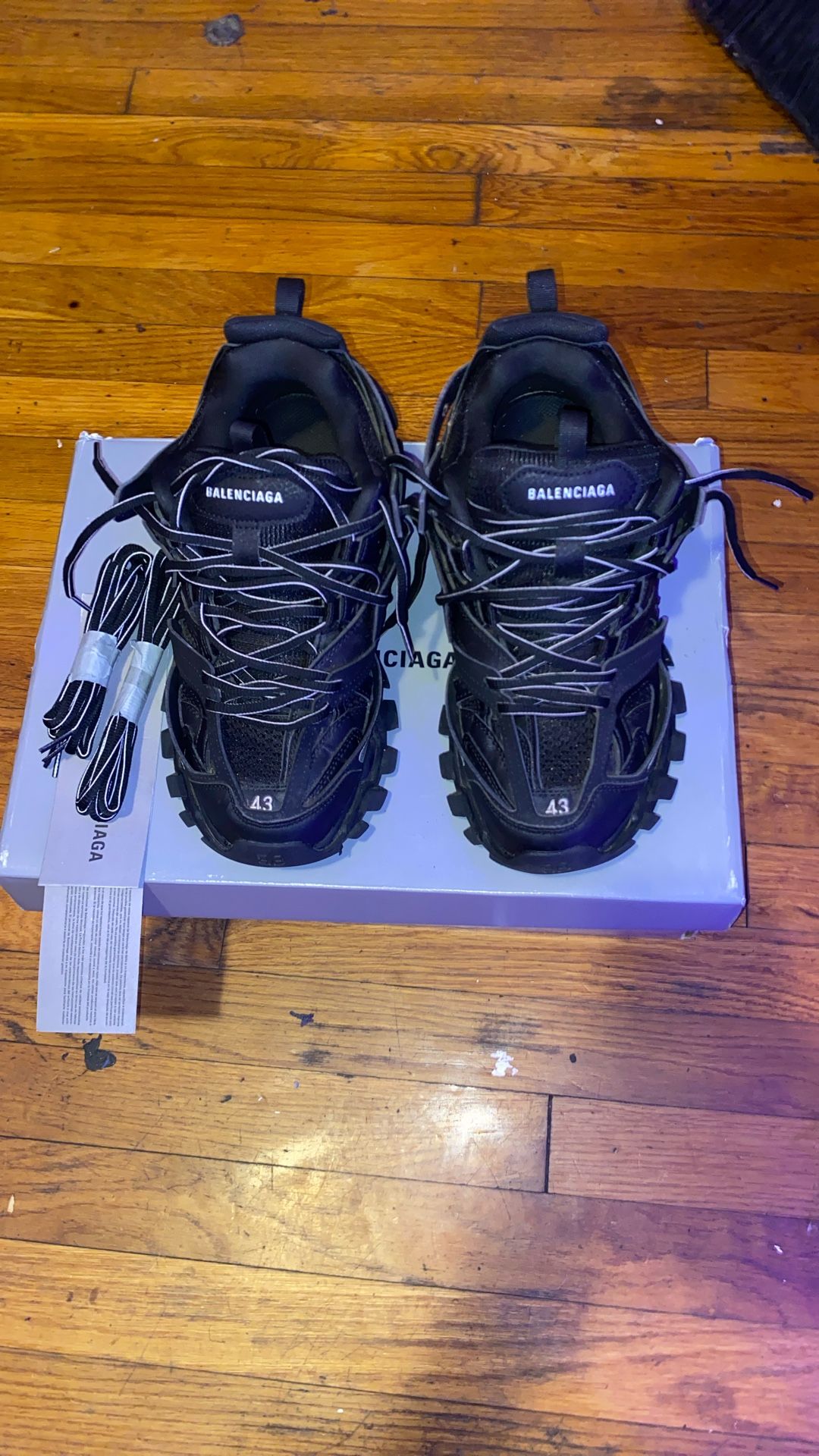 Balenciaga track runners, washed black and white comes with an extra pair of shoelaces and also comes with a Balenciaga bag a box