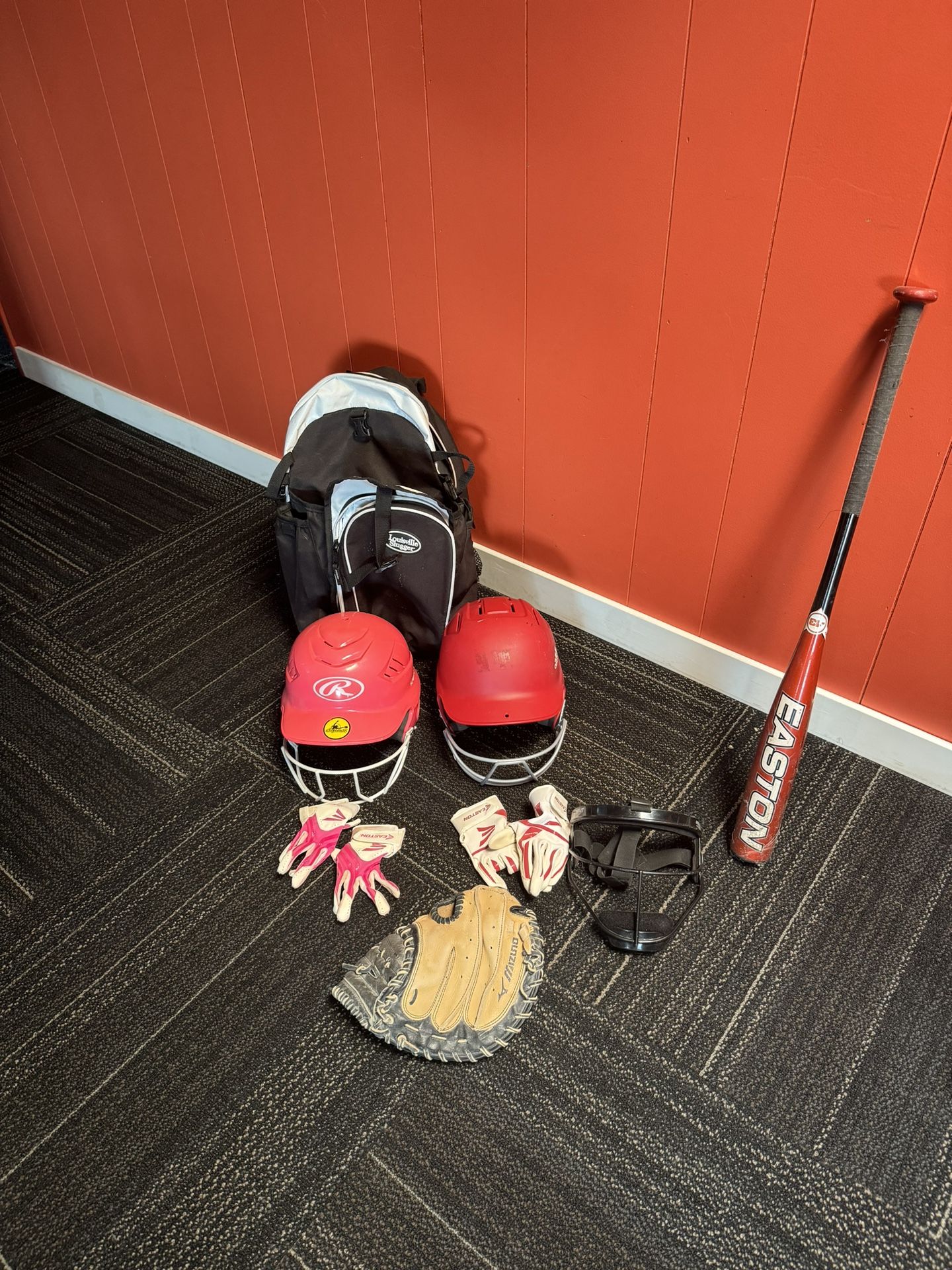 Softball gear protection come with: two helmets and matching gloves (red and pink), catching glove, bat, face protection and backpack.