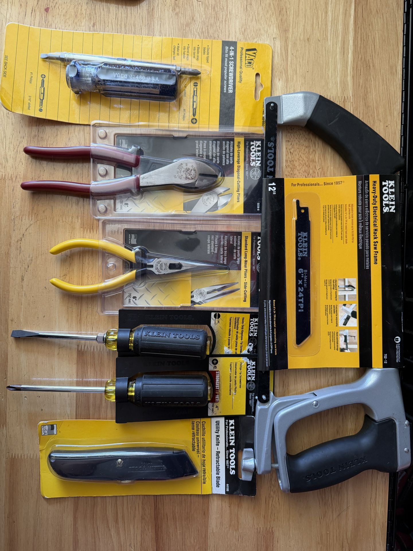 Brand new Klein standard long nose pliers Klein high leverage diagonal cutting pliers Klein phillips and flat head screw driver Klein utility knife Klein Hack Saw Vaco 4-1 Screwdriver