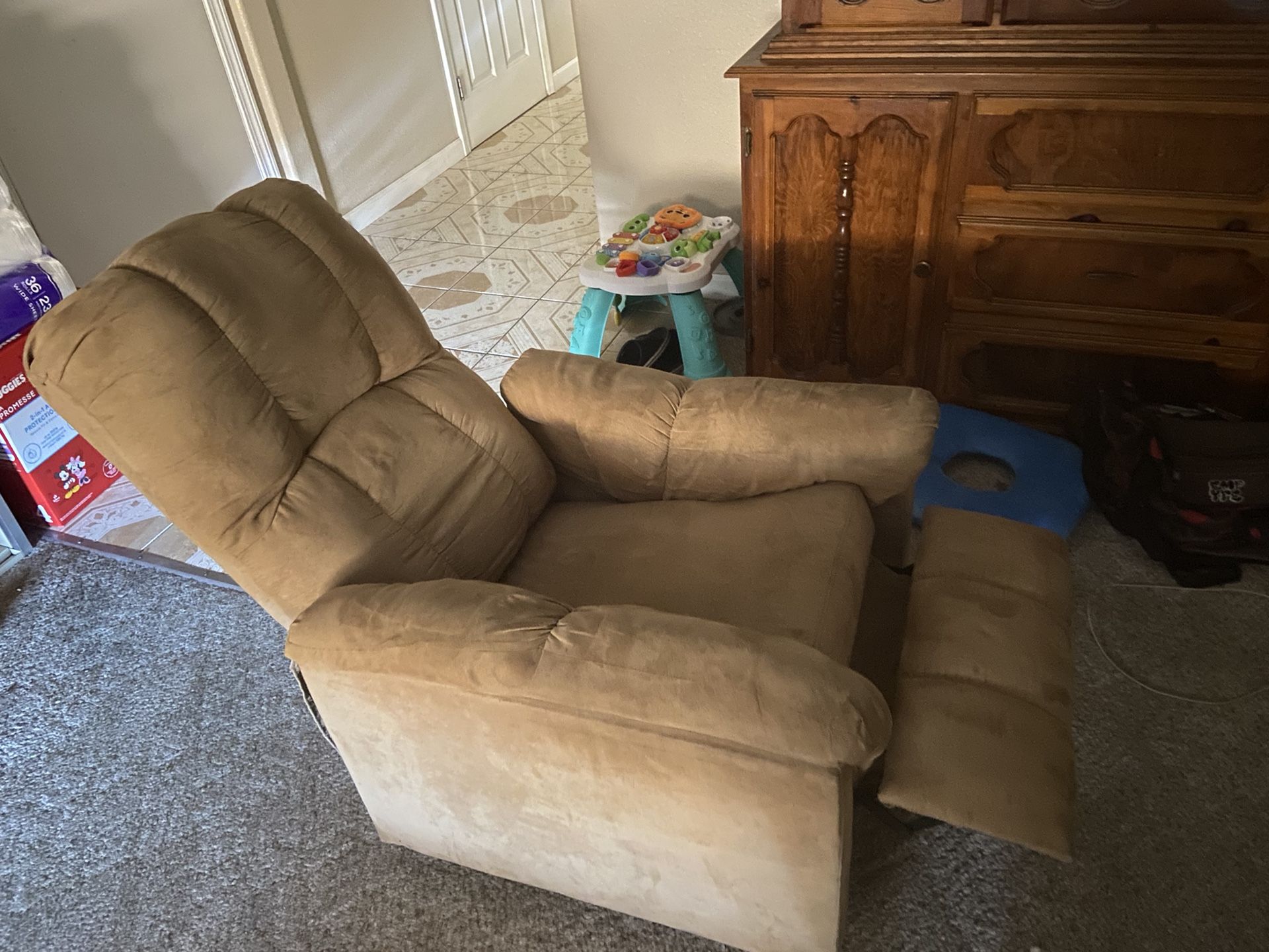 Medium sized Dorel Asia recliner chair. Used but like new with no scratches/ tears. All feet are strong on the bottom with none missing. Light brown in color. Fully funcțional as it has 2 reclining positions.
