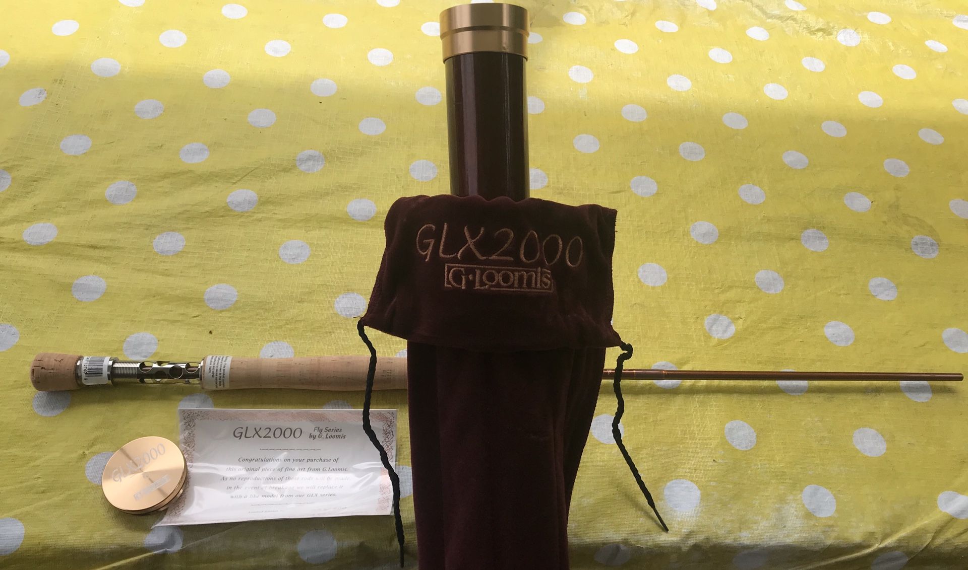 Brand new GLX 2000 fly road, 7 wt. 4 pcs. Fuji gold cermet guides. Chameleon gold paint. Cherry rod sock and tube. Certificate of origen 123 of 200 made