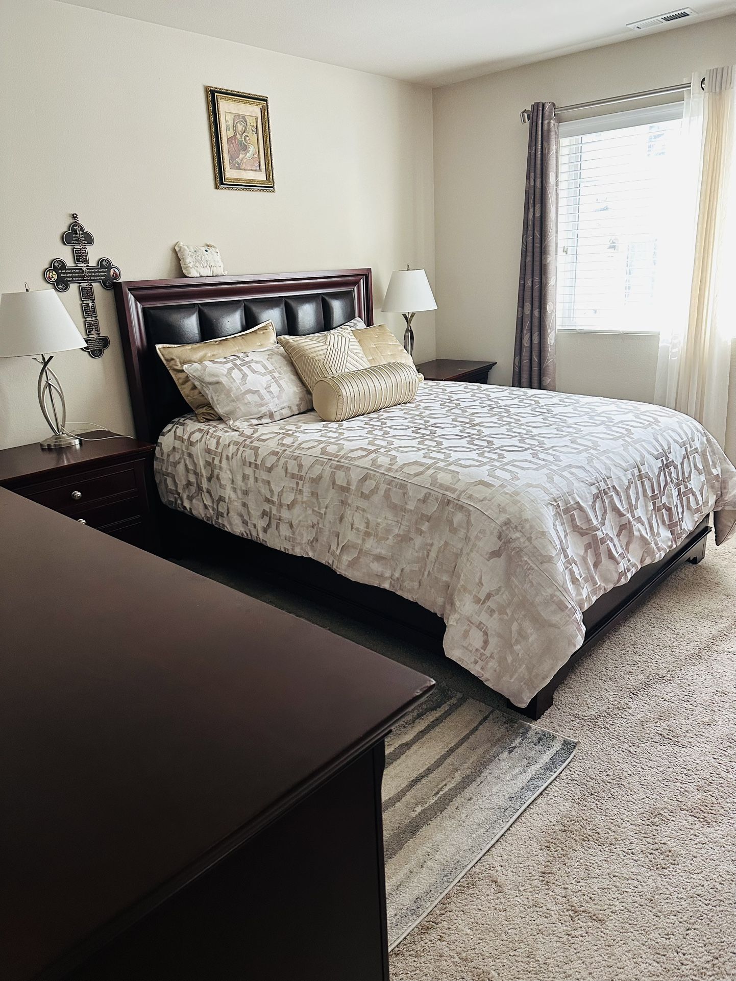 Gentle used 5 piece furniture set. Only sold as a set. Small imperfections shown in photos. Overall in very good condition. No delivery. Measurements: - Nightstand: 23 1/2 inches wide & 28 inches length - Bed frame 86 1/2 wide & 53 inch length - Dresser 42 inches wide & 60 inches length - Dresser with mirror 78 inches length & 69 inches width