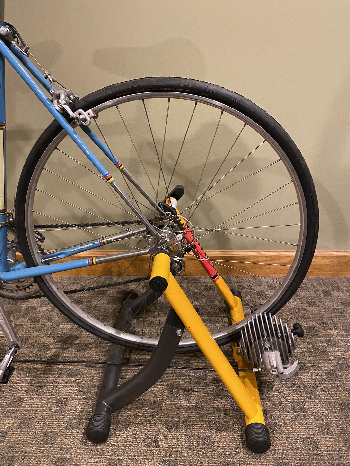 Mount your bicycles rear wheel in this trainer and stay fit or get in shape this winter. Variable resistance and so quiet you won’t disturb others while exercising.