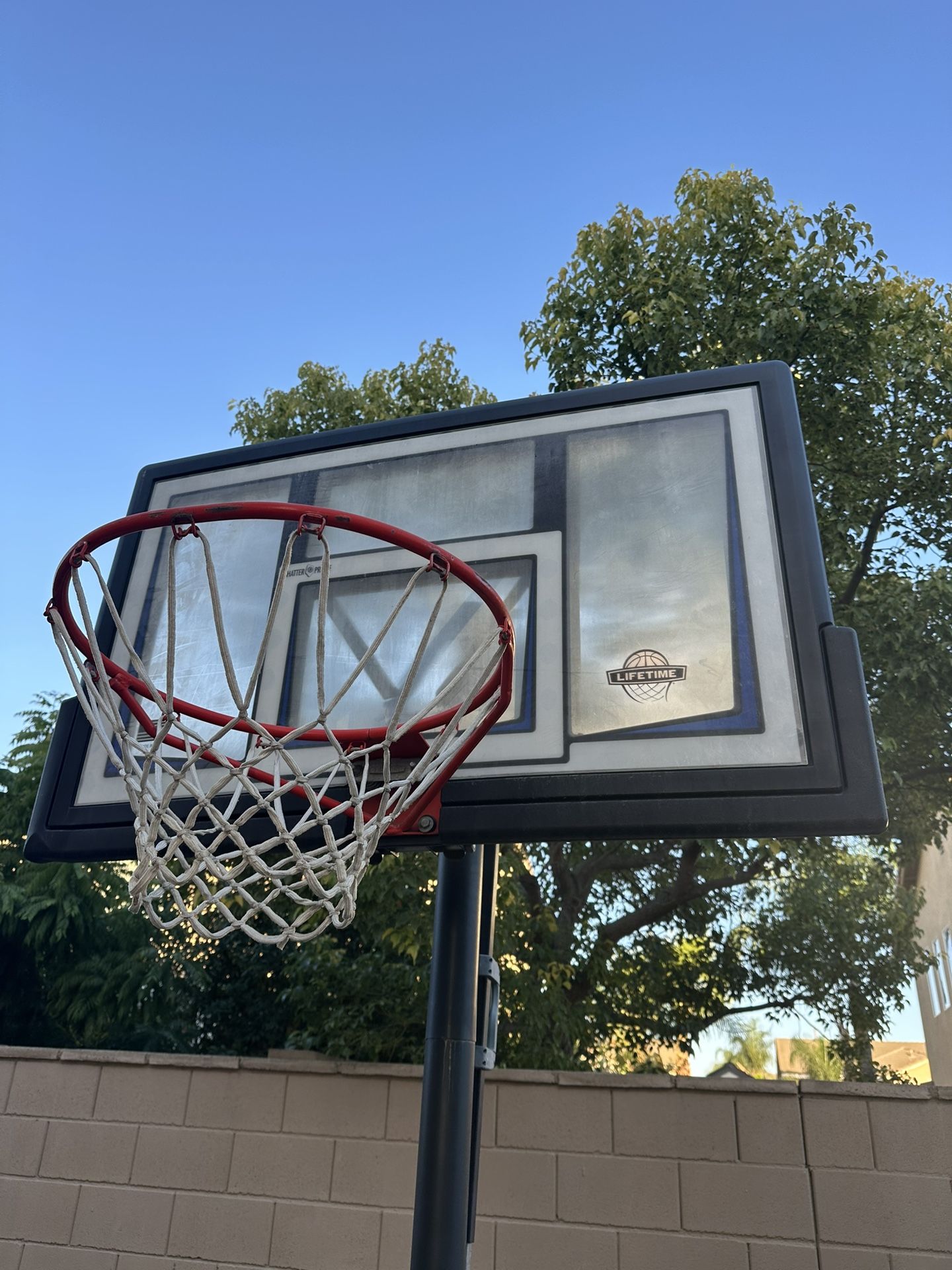 Very well condition. Highlights -Shatterproof Fusion™ Backboard -Slam-It® Rim -Fade-Resistant Graphics -All-Weather Net -Speed Shift Adjustment -Heavy-Duty Portable Base Description Want to take your game to the next level? Reach new basketball heights with the Lifetime 48-Inch Fusion Portable Basketball Hoop. Enjoy high-level play on a premium hoop with a 48-Inch Shatterproof Fusion Backboard, virtually indestructible and with great rebound action. Set it up wherever you want using the Heavy-Duty Courtside Portable base, and play without limits on the premium Slam-It® Rim. An all-weather net and fade-resistant graphics will keep the maintenance low and the excitement high. You can adjust the hoop height easily using the Speed Shift adjustment mechanism. For a premium basketball experience you can enjoy at home, look no further than the Lifetime 48-Inch Fusion Portable Basketball Hoop.