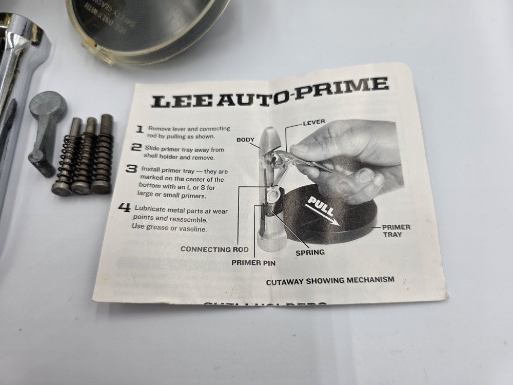 Lee Auto-Prime hand-held priming tool. This is the original, highly-regarded design known for giving reloaders a great "feel" when seating primers. It is a must-have for any reloading bench, offering more speed than a press-mounted system and more precision than many modern alternatives. What’s Included This set is exceptionally well-outfitted and includes: Lee Auto-Prime Tool Body: Polished chrome finish in good working condition. Two Primer Trays: Includes both the Large (black/clear) and Small (yellow/clear) primer trays. Complete Internals: Connecting rod, lever, and primer pins. Bonus Spare Parts: Includes 4 primer pin/spring assemblies (various sizes) and a spare connecting rod/linkage. Original Documentation: Includes the original instruction sheet with the "Cutaway Showing Mechanism." Original Box: Includes the vintage Lee Precision, Inc. cardboard box. Condition Mechanical: The tool and linkage move freely. The trays are clear with no major cracks, though they show typical light wear from age. Cosmetic: The chrome body is bright. The box and instructions show some staining/oil spots consistent with a garage or workshop environment, adding to its vintage character. Note: Please see photos for everything included. Note: Requires Lee Auto-Prime specific shell holders (not included). Shipping & Handling Fast shipping via USPS Ground Advantage. Carefully packed to ensure the vintage box and plastic trays arrive safely.