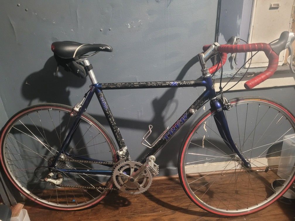Excellent-condition 1994 Trek 2100 ZX Carbon Series road bike. No rust, no chips, carbon is fully intact with zero separation. Vintage 1994 Trek 2100 ZX Carbon Series road bike in excellent cosmetic and mechanical condition. Early Trek carbon-composite frame that rides smooth and fast. 2x7 drivetrain Shimano RX100 STI brifters Shimano 105 front & rear derailleurs + 105 crank Shimano RX100 hubs & brakes 700c wheels No chipping, no rust Carbon is fully intact — no cracks or separation New brake cables & housing Extras: saddle bag + extra set of Shimano clipless pedals Clean, well-kept, and ready to ride. Hard to find a 90s Trek carbon bike in this condition.
