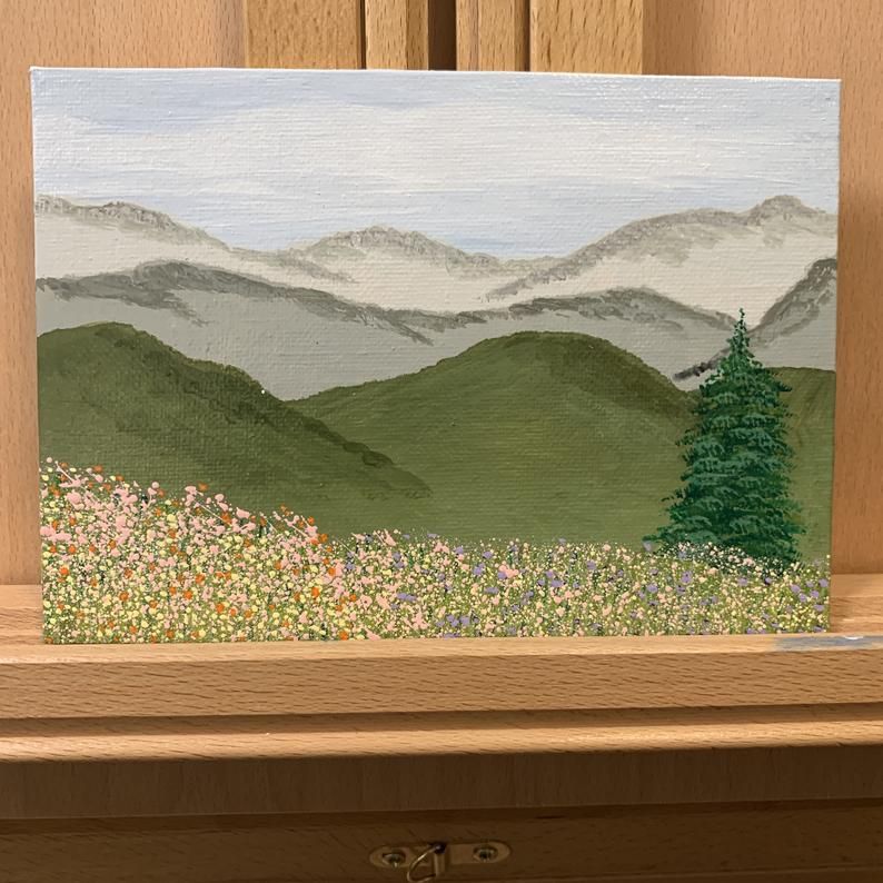 Mountains and Wildflowers Original Acrylic Painting With Beautiful Colors, Artist Signed, 5 x 7