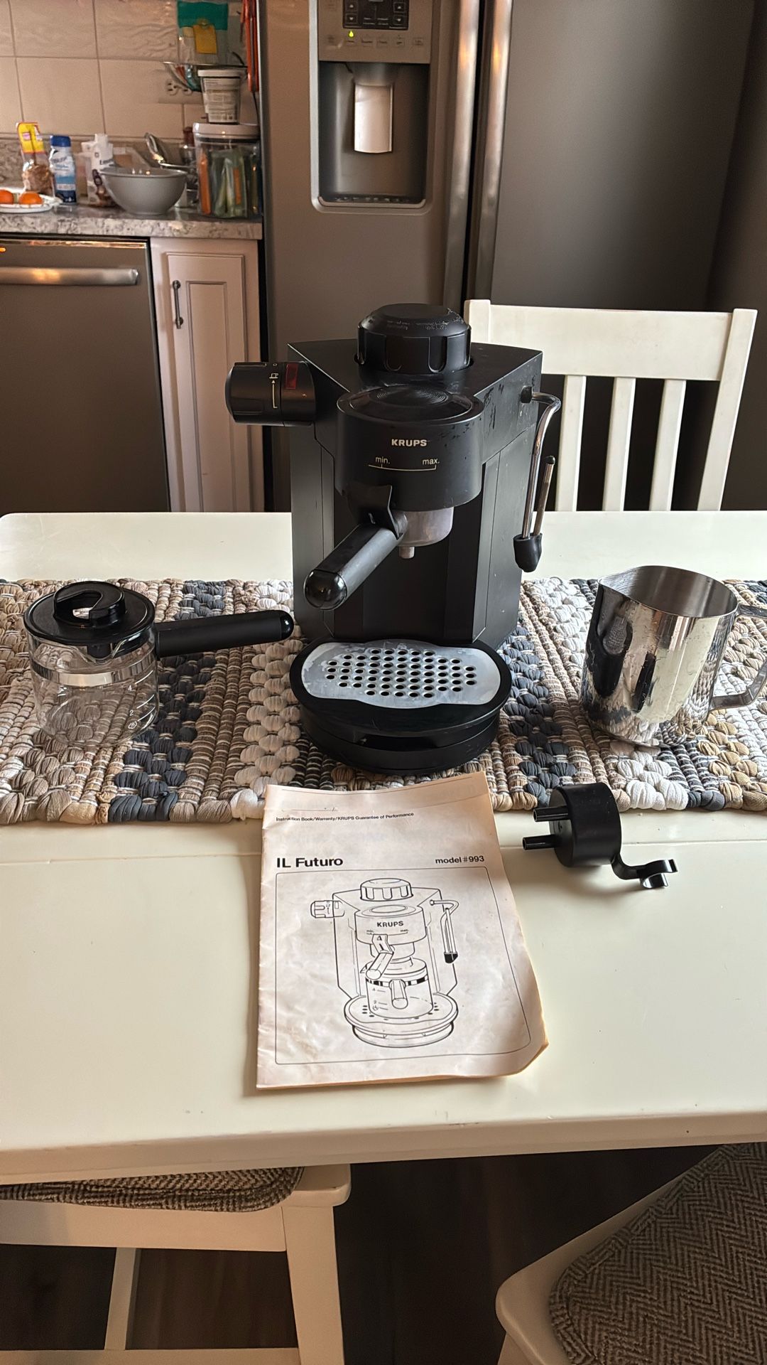 Easy to use. Easy to clean . Makes great espresso to drink or use as base for lattes or cappuccinos etc. frother on board! direction book included.