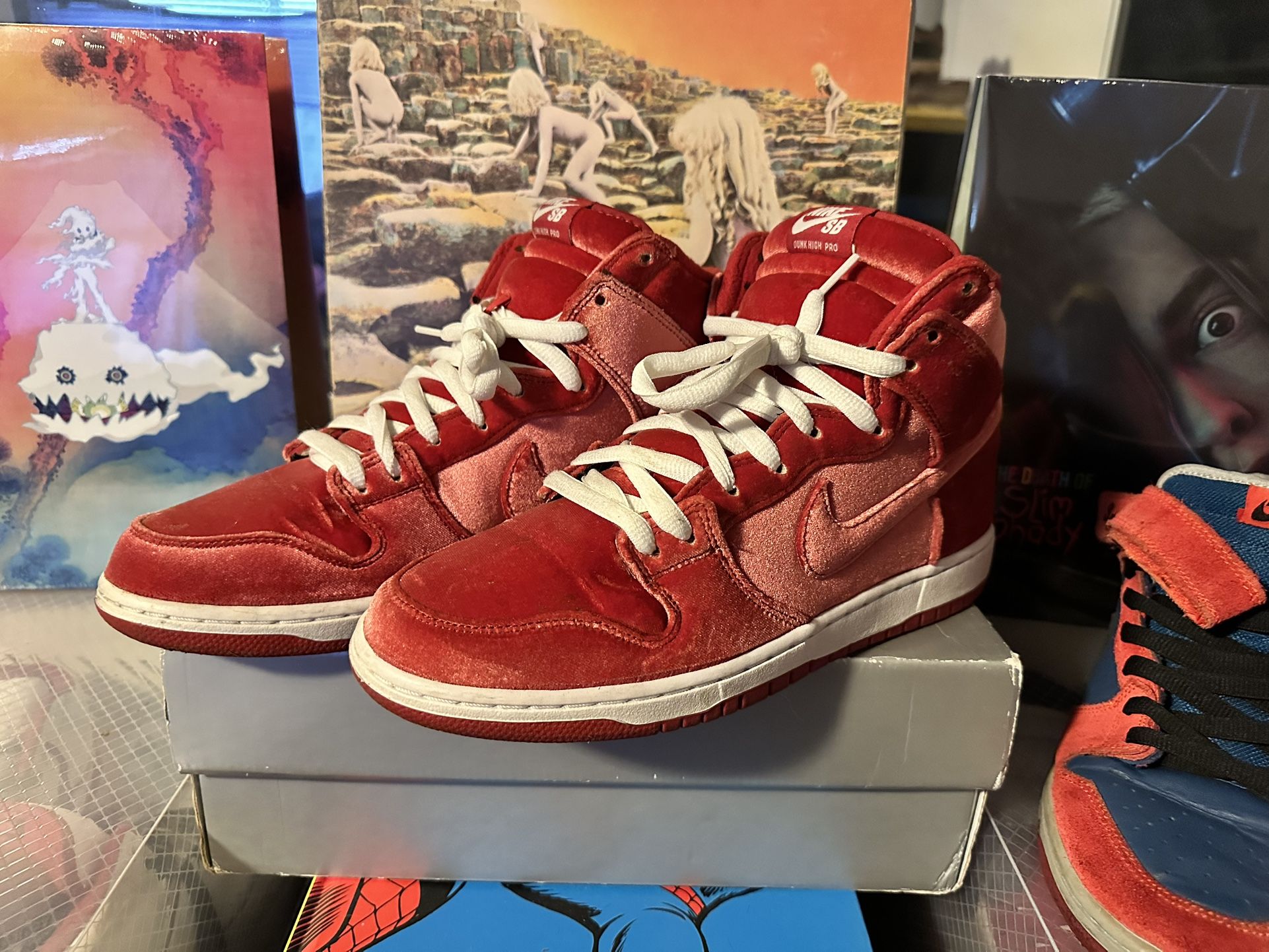Nike SB Dunk High “Red Velvet” – Size 10.5 $140 Size 10.5 Nike SB Dunk High Red Velvets in good condition. No box. Sold as is. The velvet upper is still crisp and they’ve got plenty of life left before they retire to a closet museum. For reference: new pairs have averaged about $250 over the past five years. These? $140. You’re not touching a pair at this price on eBay once shipping, taxes, and fees get involved. Those extra charges hit like a surprise parking ticket. If you like SBs, velvet, or the general concept of paying less than the internet, these are ready to go. Must pick up in Rosemead. Cash or Apple Pay.