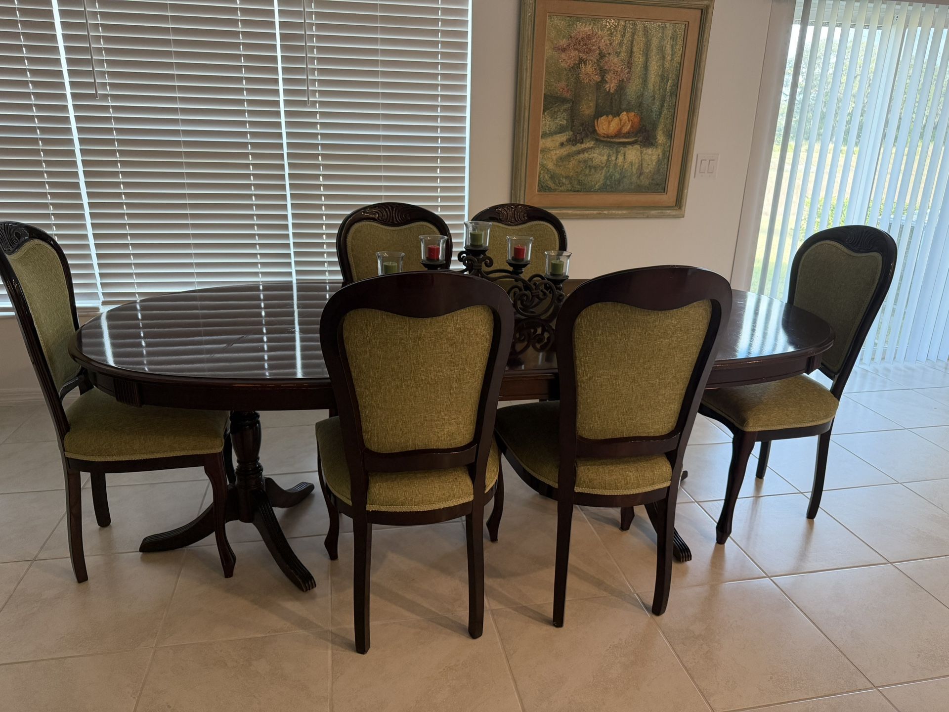 • Real Wood table is HEAVY Vintage •6 chairs •oval table • some stretches on table •fabric on chairs have no marks or stains •can removable table piece to make table smaller •Length is 89 inch and a half Ft is 2 and 29 inchs