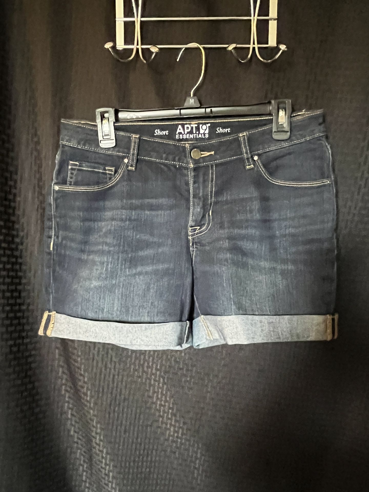Apt. 9 Essentials Cuffed Denim Jean Shorts Like New Size 8 Dark Wash Approximate measurements: Waist laying flat: 16.25” Mid-Rise: 9” Inseam: 5” 83% Cotton, 16% Polyester, 1% Spandex RN# 73277