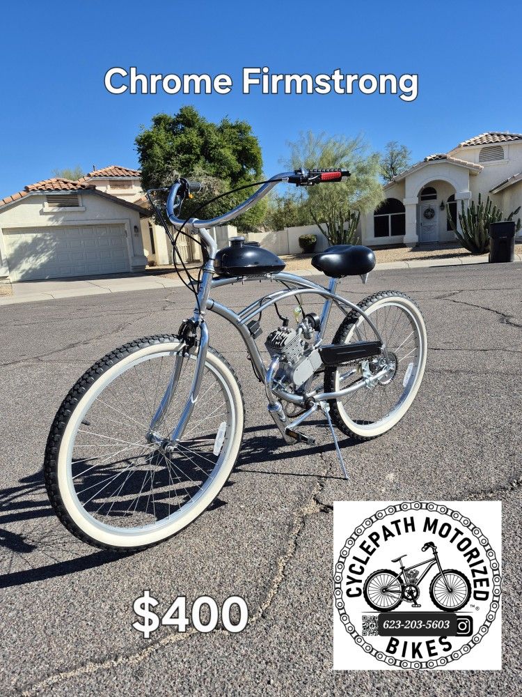 Before you decide, I encourage you to view the other bikes for sale. Then come and see a Cyclepath bike – the difference in build quality, components and craftsmanship will be obvious. ALL CYCLEPATH BIKES ARE BRAND NEW BUILDS The many benefits of building motorized bikes using new equipment are safety related. All custom bikes are built and crafted by an experienced Arizona builder. We only use premium motors,( Zeda Firestorm ) and durable hardware/equipment designed for performance and safety at speeds over 25 to 35 miles per hour. Don’t ask me how fast it goes it depends on your height and weight sprocket size and alot of other things. My bikes are built using quiet (95db) 80cc 2 cycle motors. They require a mixing of 2 cycle oil (we recommend Lucas) sold at any Oreilys auto parts with regular gasoline. Customers report getting up to 100 miles from 1 gallon of mixed gas. That’s 2 full tanks. Depending on where you live, that is a cost of only around $2.50-$3.00 to fill up twice. What’s not to love about getting close to 50 miles from a single tank of gas? 49cc and less you are not required to have a motor vehicle license and do not have to register or title them with the state. I double dare you visualize or see the difference between a 49cc and 80cc. I personally test-ride each custom bike I build to ensure peak performance before you take your new bike home. This provides you with “peace of mind” knowing you’re riding a brand new bike that’s safety checked and ready to ride. Don’t forget, if exercise is what you’re after, just pedal. PLUS, and this is a big one. I provide you with on-call support during your bike’s break in period. This means you can contact me with any problems or questions, and I WILL, answer your call. A service you WILL NOT find anywhere else. My custom bikes are available for viewing daily. Just text or call (Phone # is in the photos) for a faster response. Delivery is available for a reasonable gas fee. If you are looking for a safe, reliable motorized bike with value you can appreciate, come see the difference firsthand. Serious inquiries only. Looking for hassle-free, drama-free sale. Built with pride and ready to ride. Ride a bike today. Contact now to schedule a time to view.