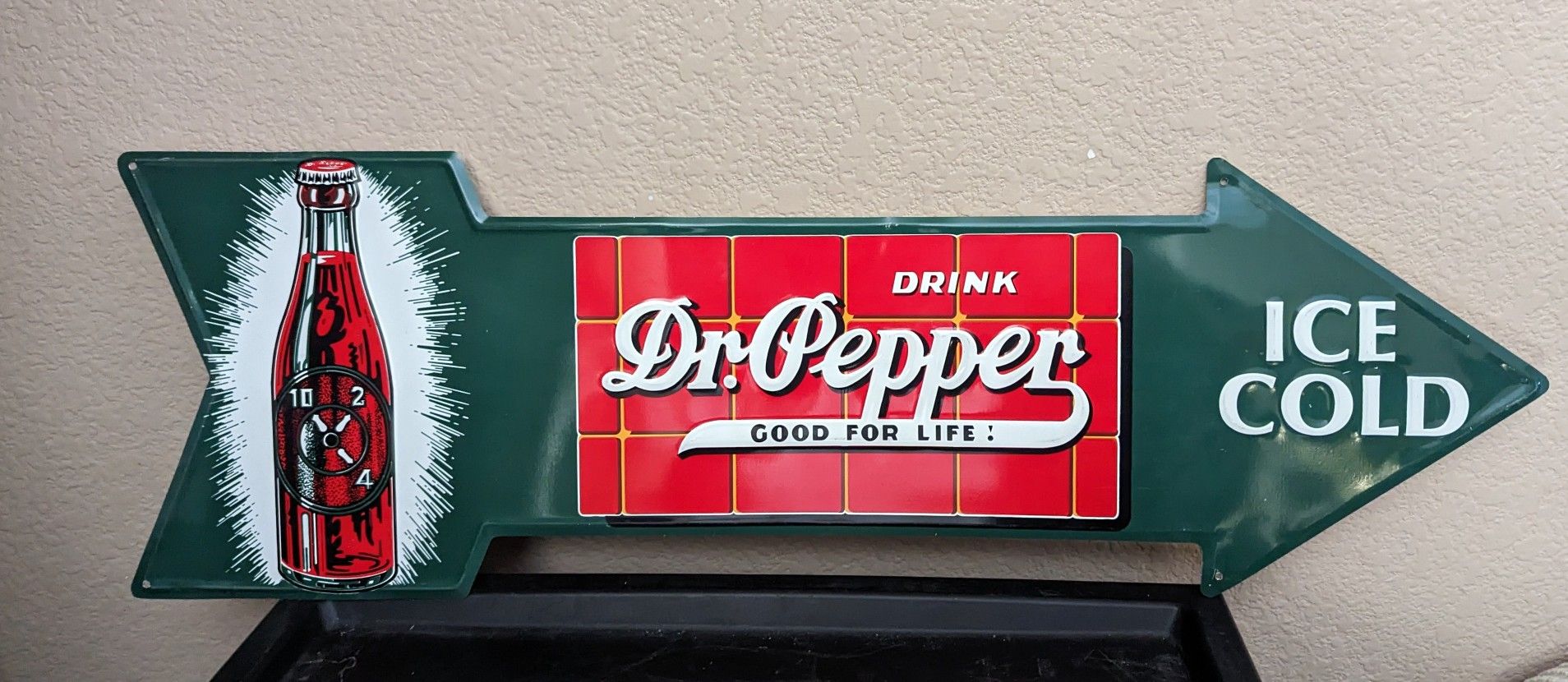 27" x 9" Metal Sign Predrilled corner holes for easy hanging Embossed features Product information- Manufacturer: Dr. Pepper Item Weight: 4.8 ounces Package Dimensions: 22.3 x 8.4 x 0.1 inches Is Discontinued By Manufacturer : No Material Type: Metal Size: Medium *used with light scratches. 1 Owner and only scratched by moving not hanging.* Good shape.