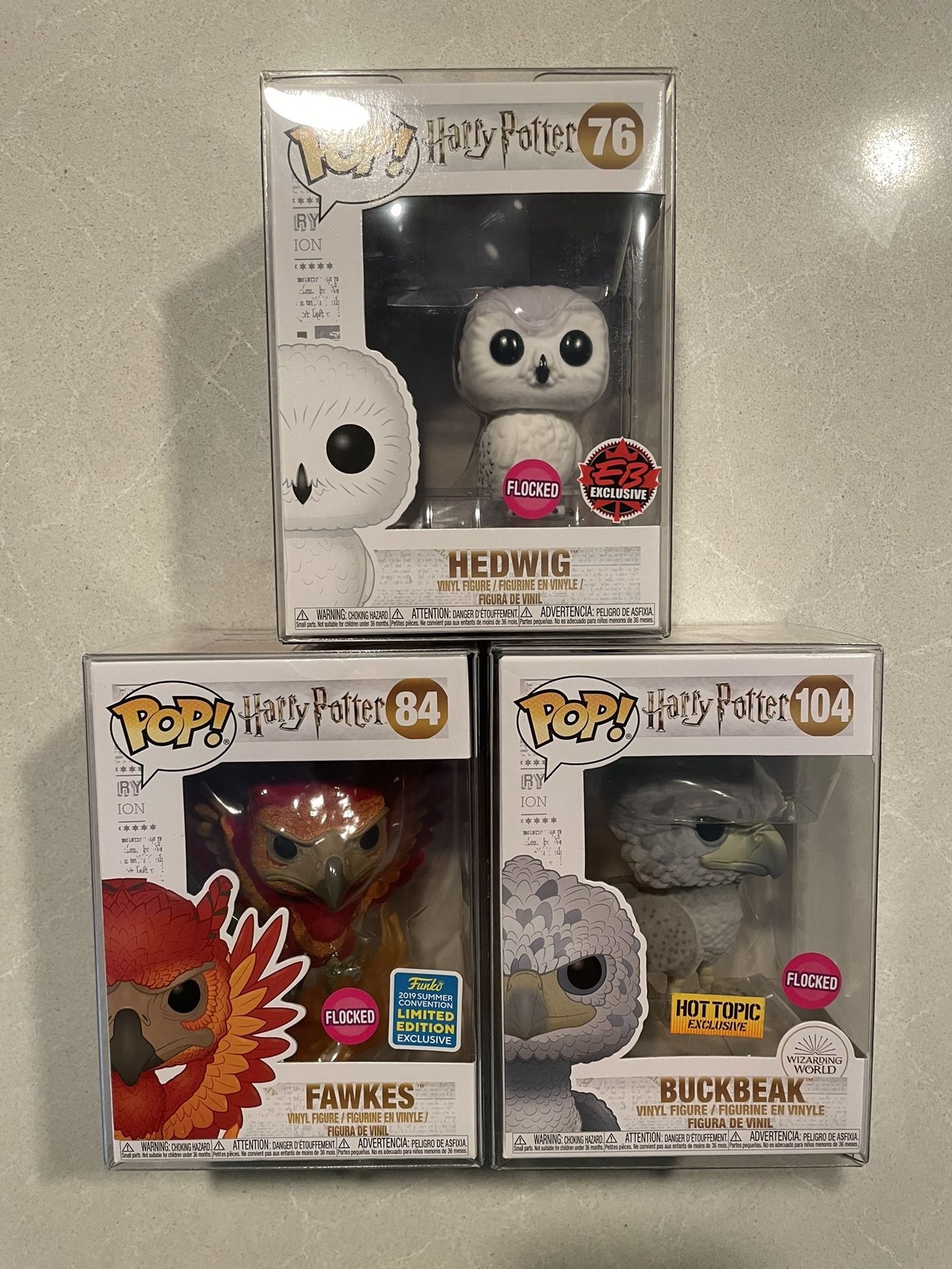 Harry Potter Flocked Bird Funko Pop Set Hedwig Fawkes Buckbeak Hot Topic EB GameStop SDCC Convention Exclusive 76 Protector 84 Hermione 104 Hagrid