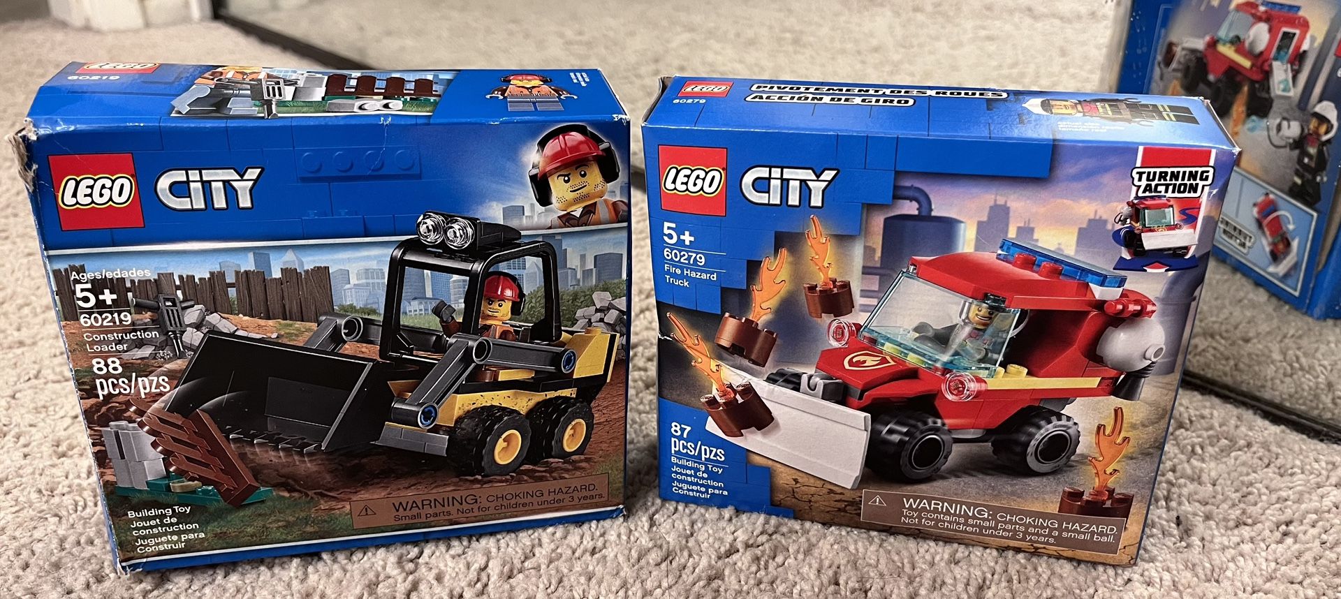 $10 each ***USED - No missing pieces*** LEGO City Construction Loader. Item Number : 60219. Pieces : 88. LEGO CITY: Fire Hazard Truck. Item number: 60279. Pieces 87.