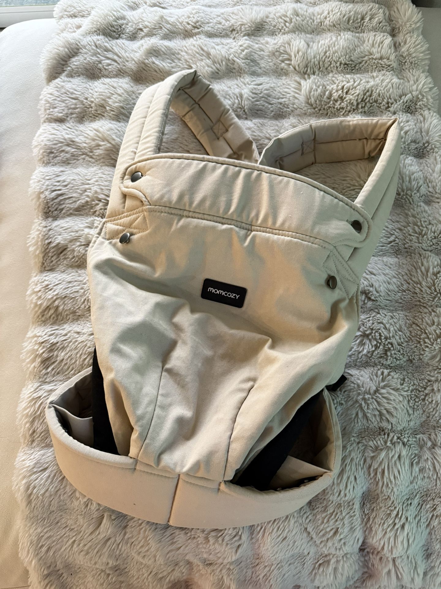 Selling our momcozy baby carrier in the color "Cotton-Khaki". Can be used for babies 7-45 lbs. Only used once to get around the airport! Originally $70 Smoke-free, clean home 🩷