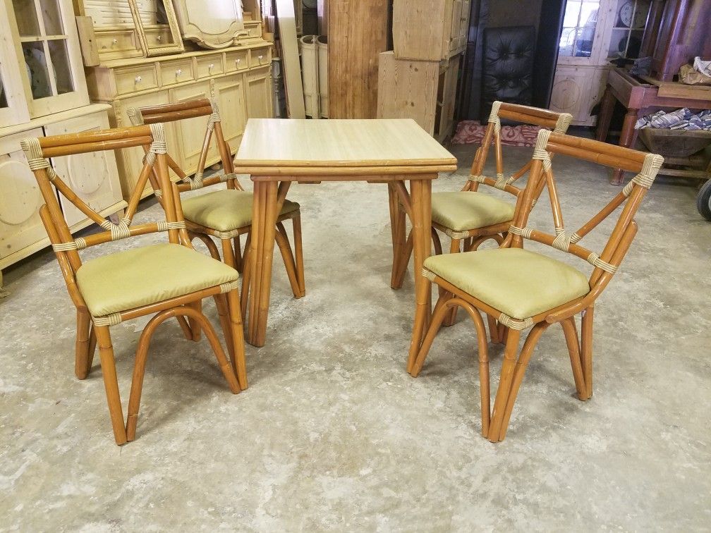 This is an Original condition Haywood Wakefield Bambooset of 4 chairs and table. The table base pulls out to support the flip top table