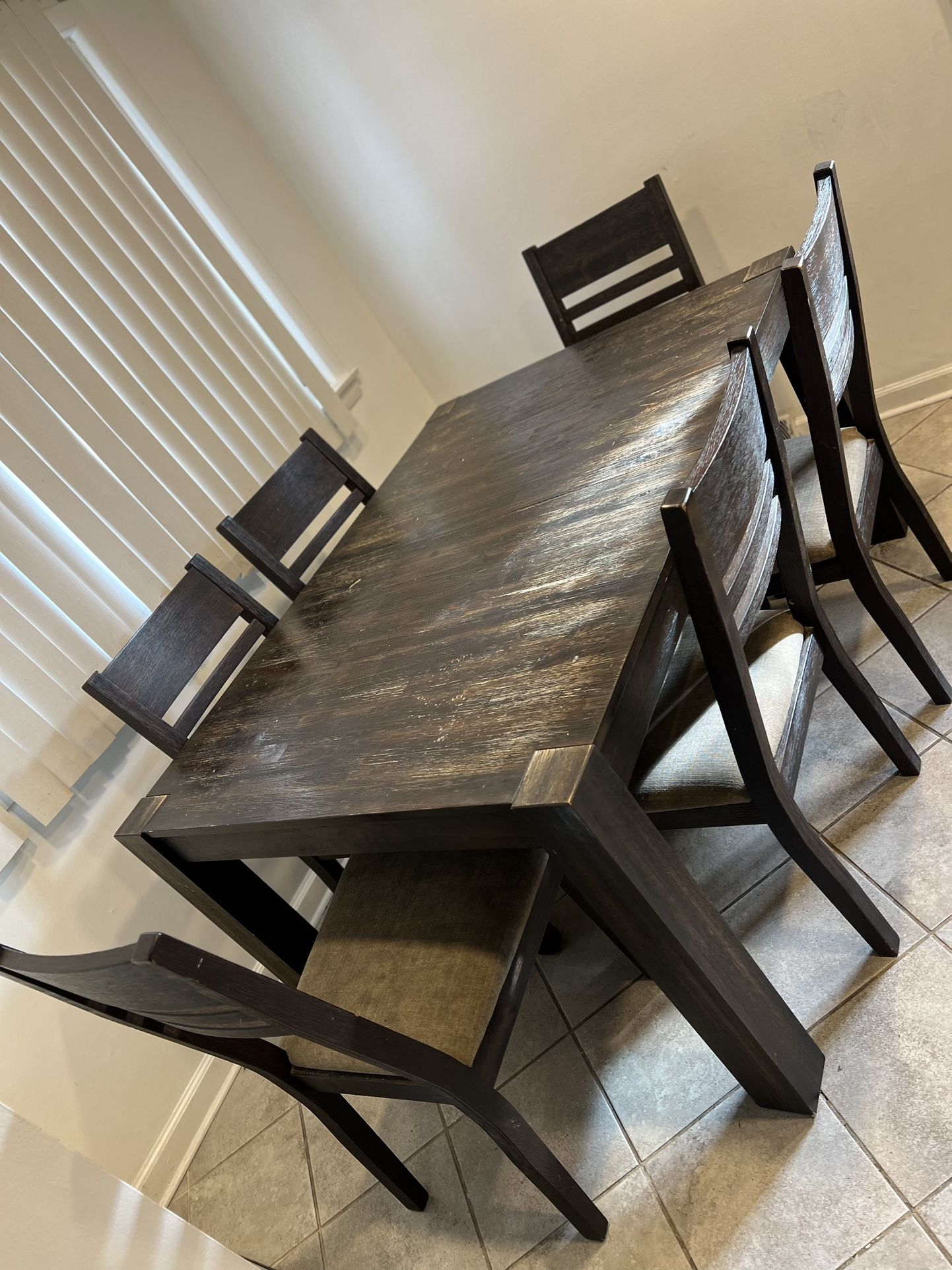 All chairs and legs of the table still all work properly also I have the leaf that goes in the middle to extend it. Needs a little TLC scrubbing and fresh paint. Lmk if your interested delivery is available for an additional fee. 250$ or best offer at this point.