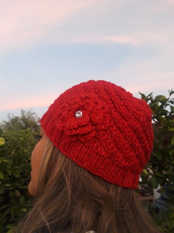 A beautiful hand knitted sparkly red spiral beanie with a crochet flower and center jewel. Machine washable on delicates and dry on low A beautiful beanie for any occasion, perfect for a gift, and cozy for the holiday weather. Shipping only
