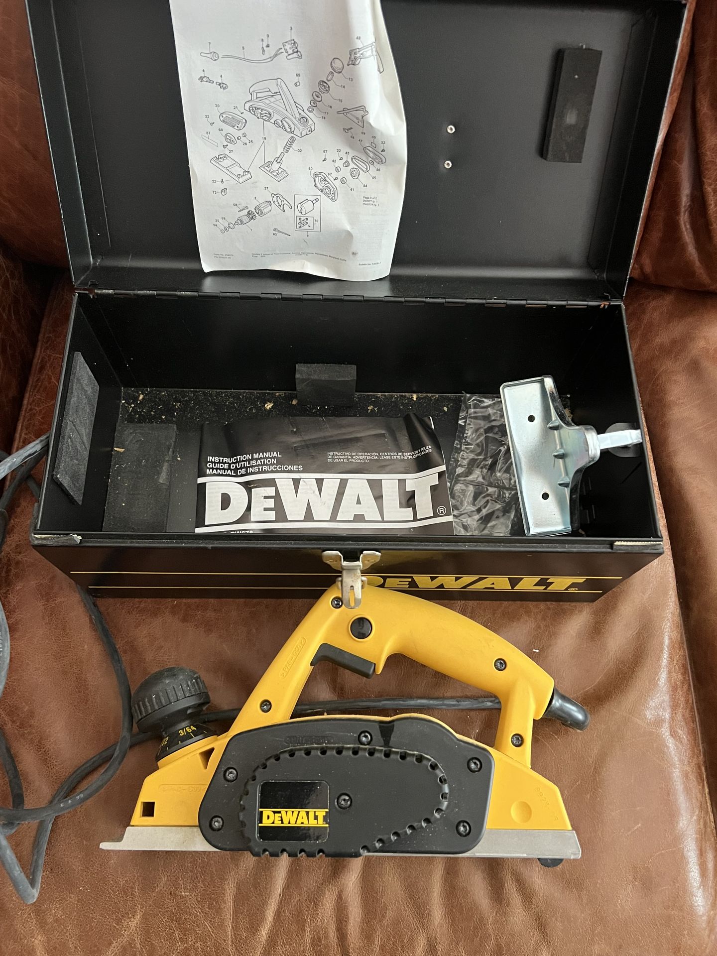 DEWALT 3-1/4 in. Corded Hand Planer, specifically model DW680K. It features a heavy-duty 7.0 Amp motor designed for finishing hard woods. The planer has a maximum cutting depth of 3/32in (2.5mm) per pass It includes a metal kit box, a rabbeting fence, and two reversible carbide blades. The front-height adjustment knob is rubber-coated for better comfort and control. Includes case and manual $125
