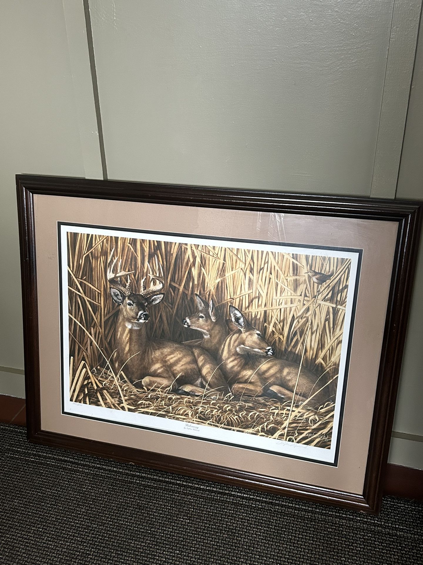 Wonderful wildlife rustic cabin Limited Edition print by Stephen Hamrick.Professionally Framed and Mounted by Sporting World, Inc. HIDEAWAY signed by Artist Features 3 deer nestled together in the field with the morning sun shining on. Full picture 33" X 25.5" Dark wood frame is 1.5"